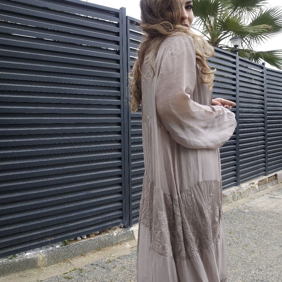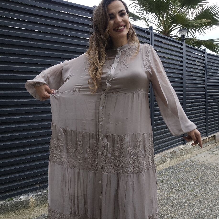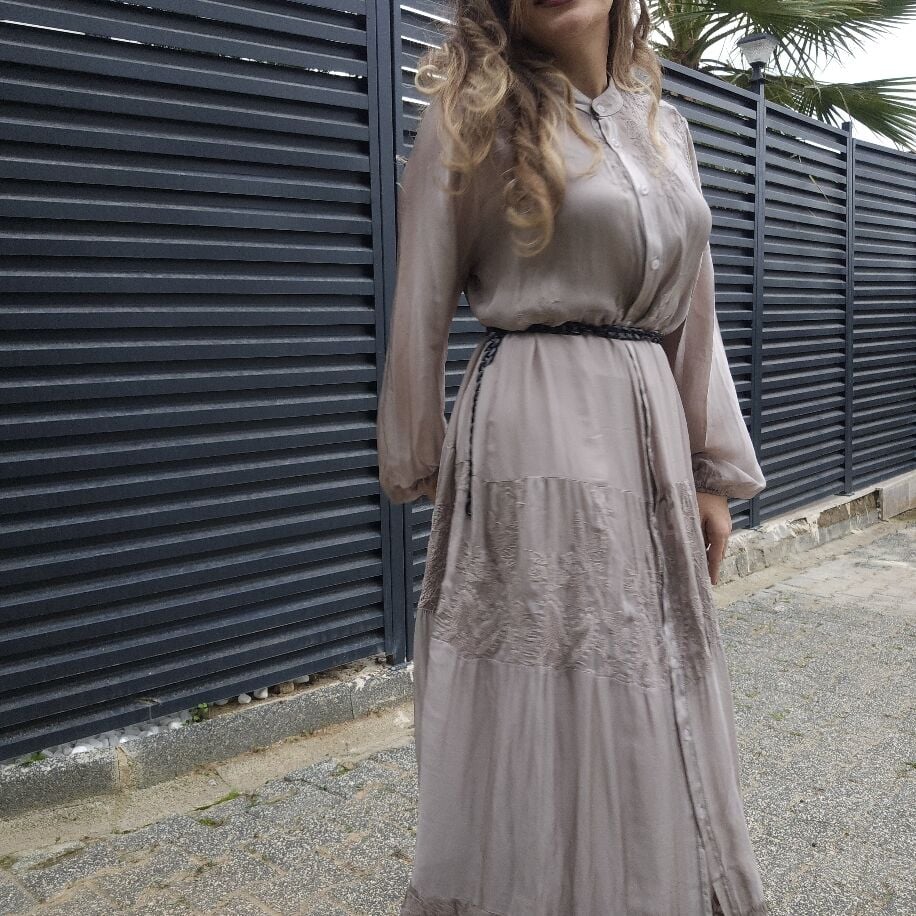 İtalyan ipeğinden özenle üretilmiş bu elbise, ön düğmeli ve iç astarlı tasarımıyla zarafeti ön plana çıkarıyor. Elbisenin üzerinde zarif dokuma işlemeleri bulunmakta ve 36'dan 44 bedene kadar rahatlıkla uyum sağlıyor. Kemer detayı ürünle birlikte gelmese de, farklı kemerlerle şık ve özgün kombinler oluşturma imkânı sunuyor.