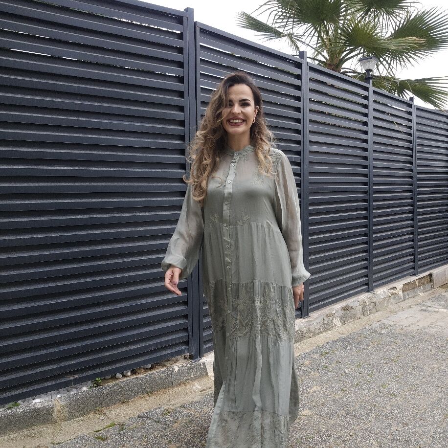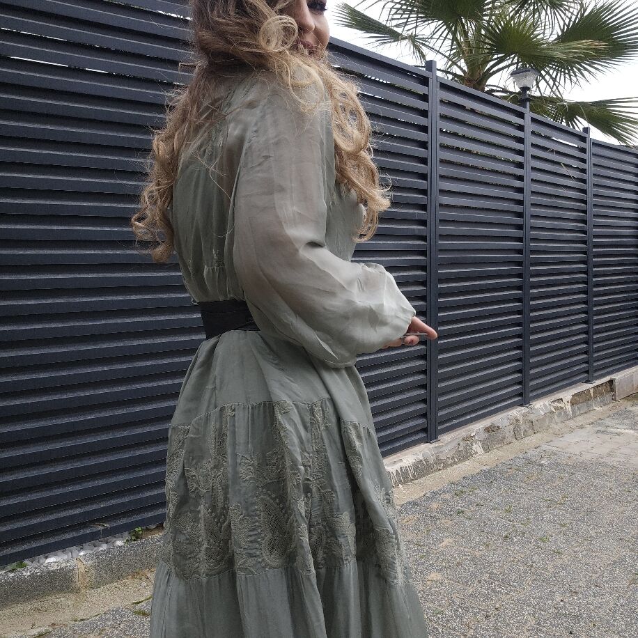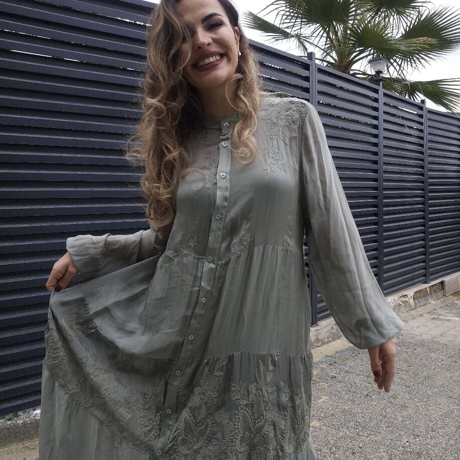 İtalyan ipeğinden özenle üretilmiş bu elbise, ön düğmeli ve iç astarlı tasarımıyla zarafeti ön plana çıkarıyor. Elbisenin üzerinde zarif dokuma işlemeleri bulunmakta ve 36'dan 44 bedene kadar rahatlıkla uyum sağlıyor. Kemer detayı ürünle birlikte gelmese de, farklı kemerlerle şık ve özgün kombinler oluşturma imkânı sunuyor.