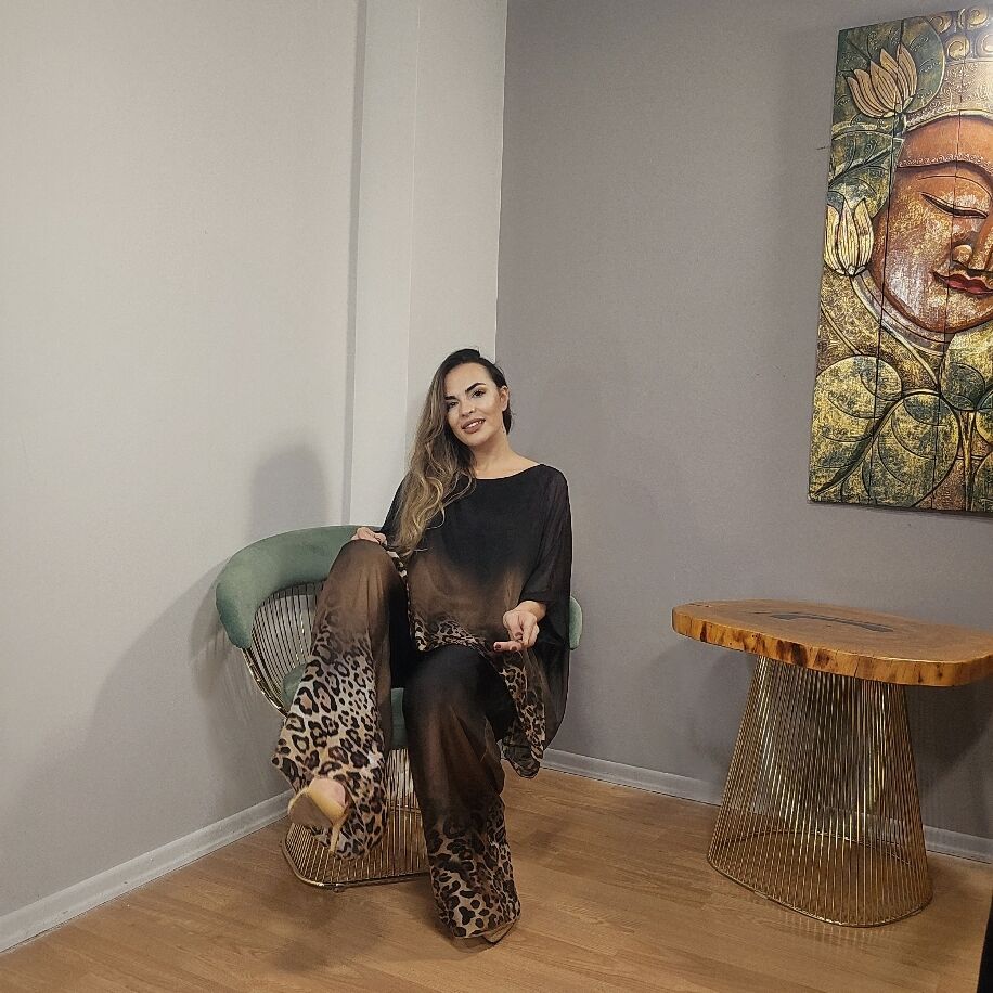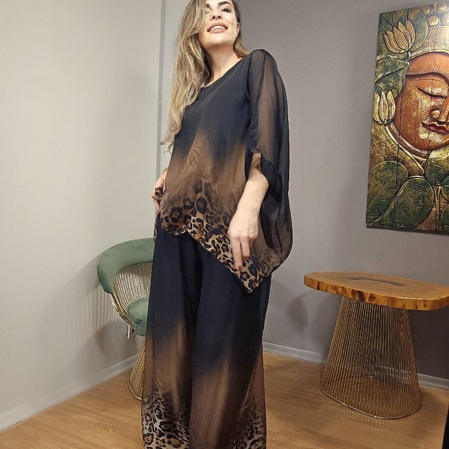 İthal İtalyan ipeğinden özenle üretilmiş bu şık set, leopar desenleri ve zarif renk geçişleriyle dikkat çekiyor. Bluz ve pantolondan oluşan iki parçalı setimiz, 38'den 44 bedene kadar rahatlıkla uyum sağlıyor.
