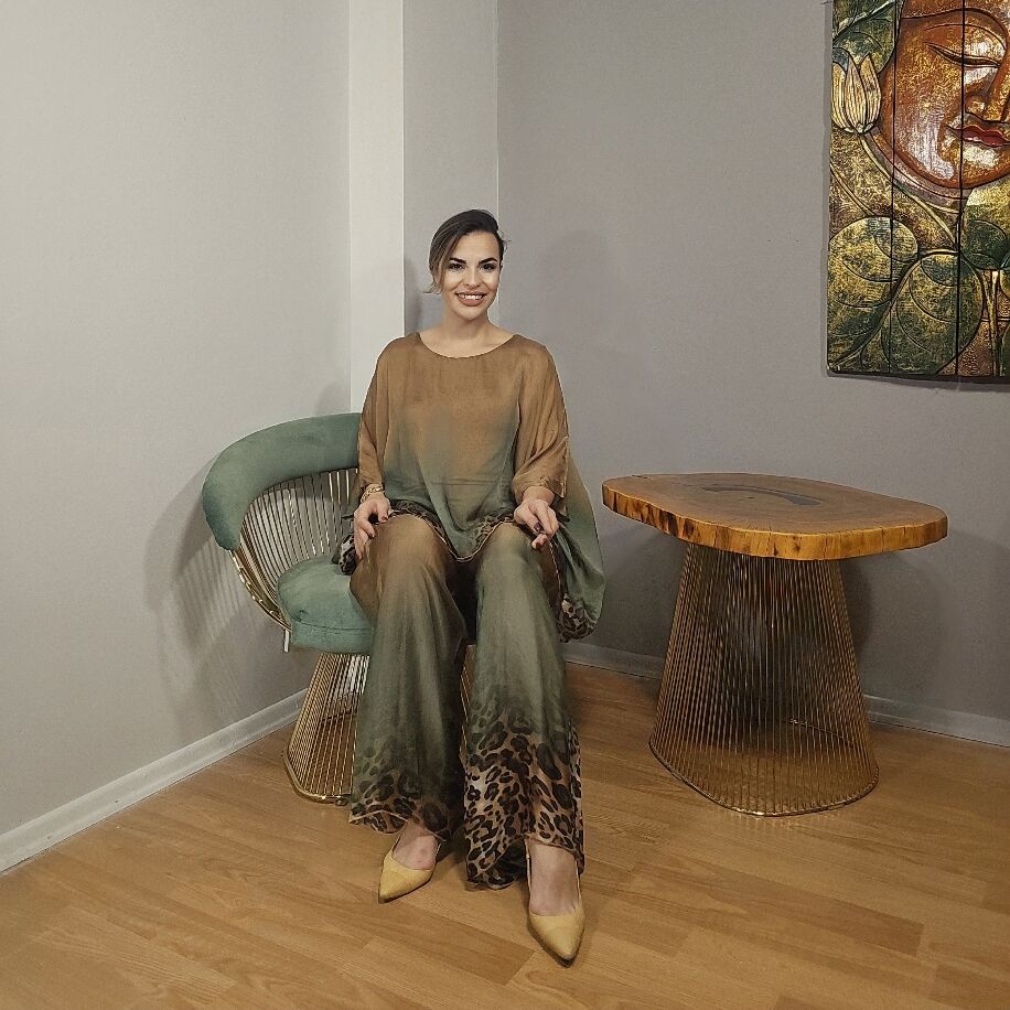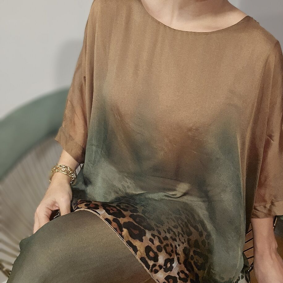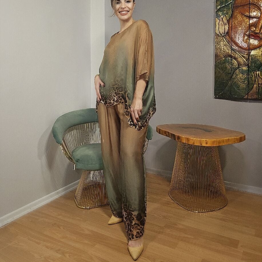 İthal İtalyan ipeğinden özenle üretilmiş bu şık set, leopar desenleri ve zarif renk geçişleriyle dikkat çekiyor. Bluz ve pantolondan oluşan iki parçalı setimiz, 38'den 44 bedene kadar rahatlıkla uyum sağlıyor.