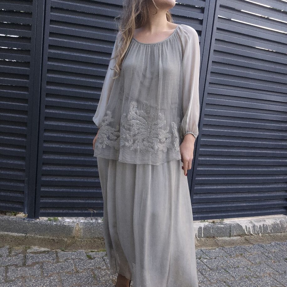 İtalyan Çiçek İpek Elbise Gri