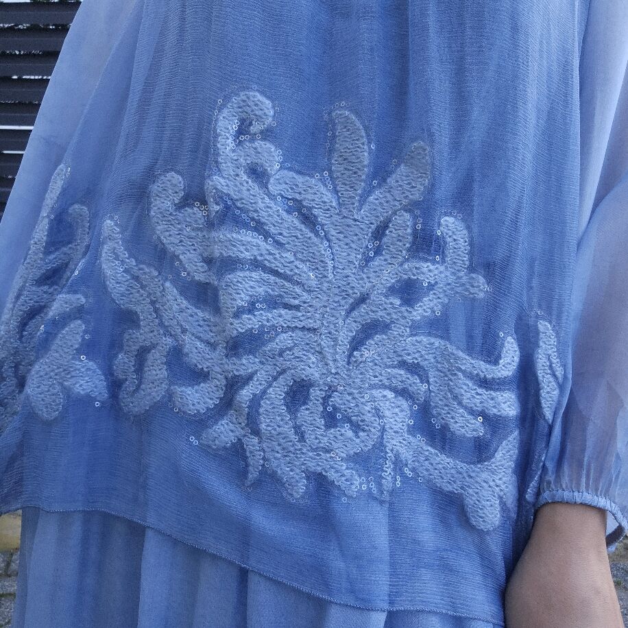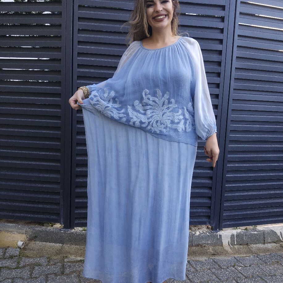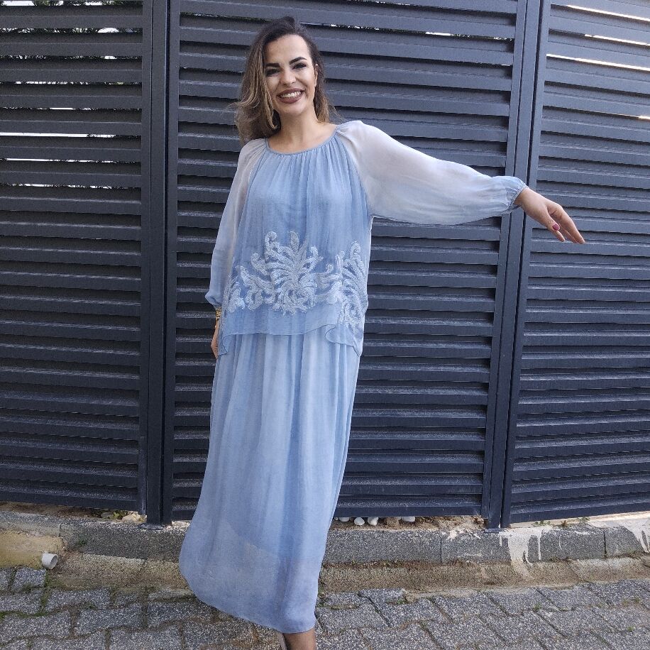 İtalyan Çiçek İpek Elbise Mavi