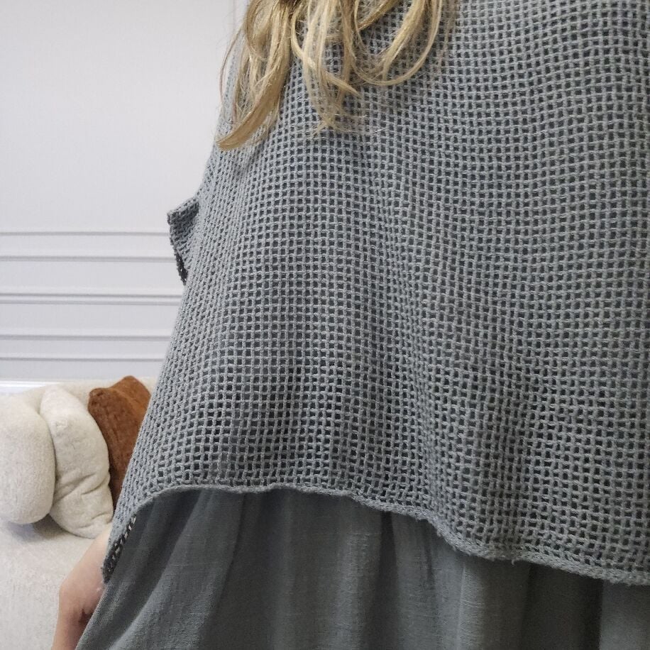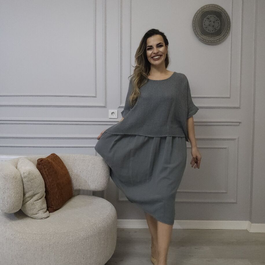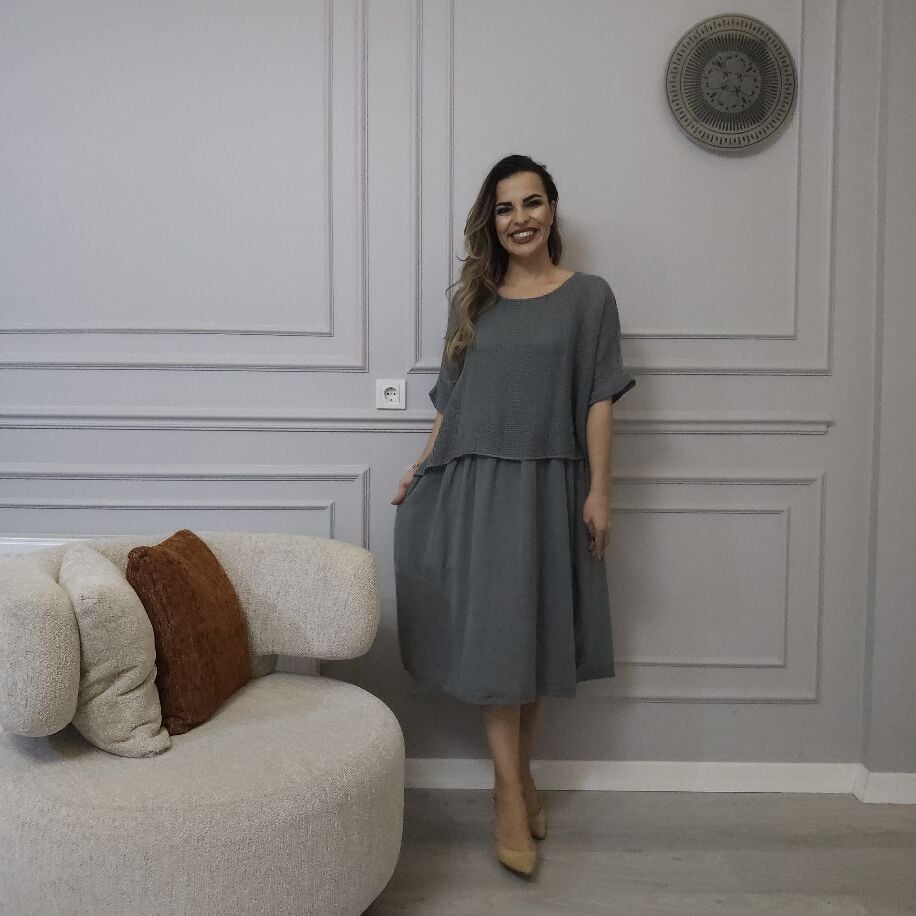 İtalyan File Keten Elbise Gri