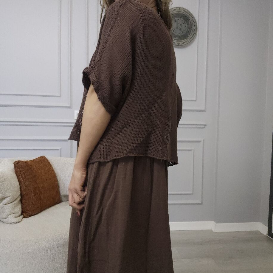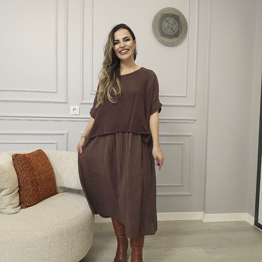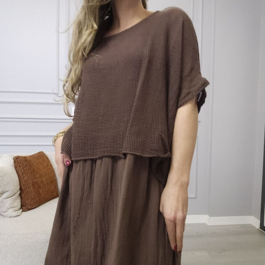 İtalyan File Keten Elbise Kahverengi