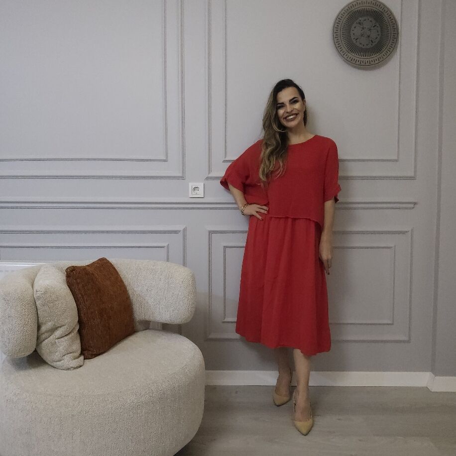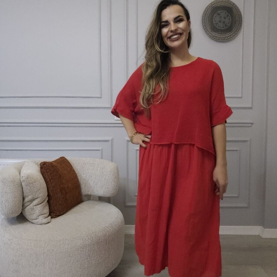 İtalyan File Keten Elbise Kırmızı