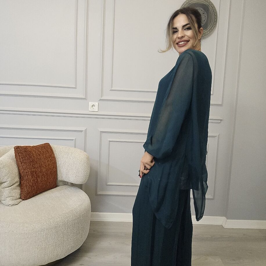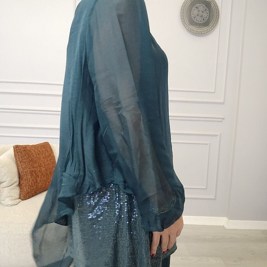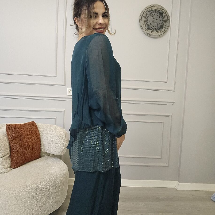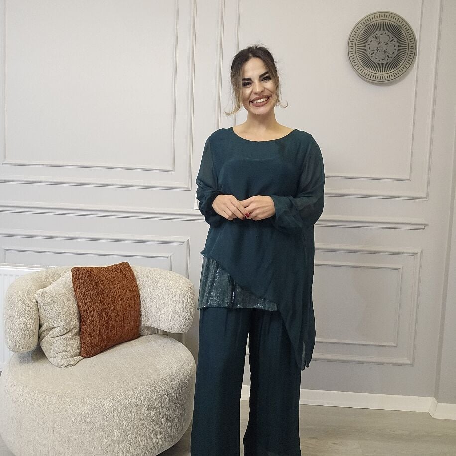 İthal İtalyan İpeği ile Zarafet ve Şıklık! Bu özel iki parçalı takım, uzun kollu bluz ve şık pantolondan oluşuyor. 36-46 beden aralığına mükemmel uyum sağlayan bu takım, iç astarı ve bilekteki lastikli detaylarıyla rahatlığı ön planda tutuyor. Bluzun çapraz inen kesimi ve kalça altına kadar uzanan payet detayı, her kombine zarafet katıyor. Bu eşsiz parça, özel davetlerden günlük şıklığa kadar her anınıza eşlik edecek.