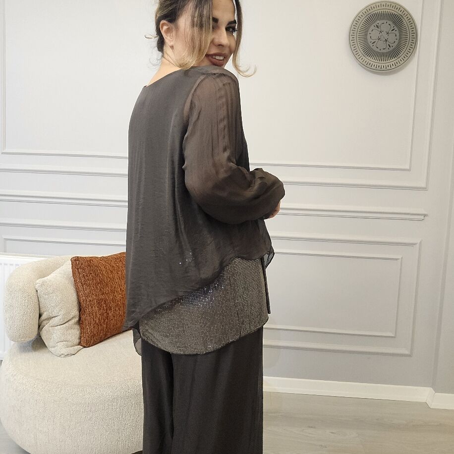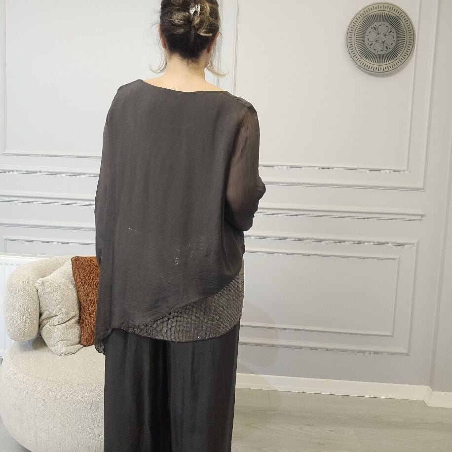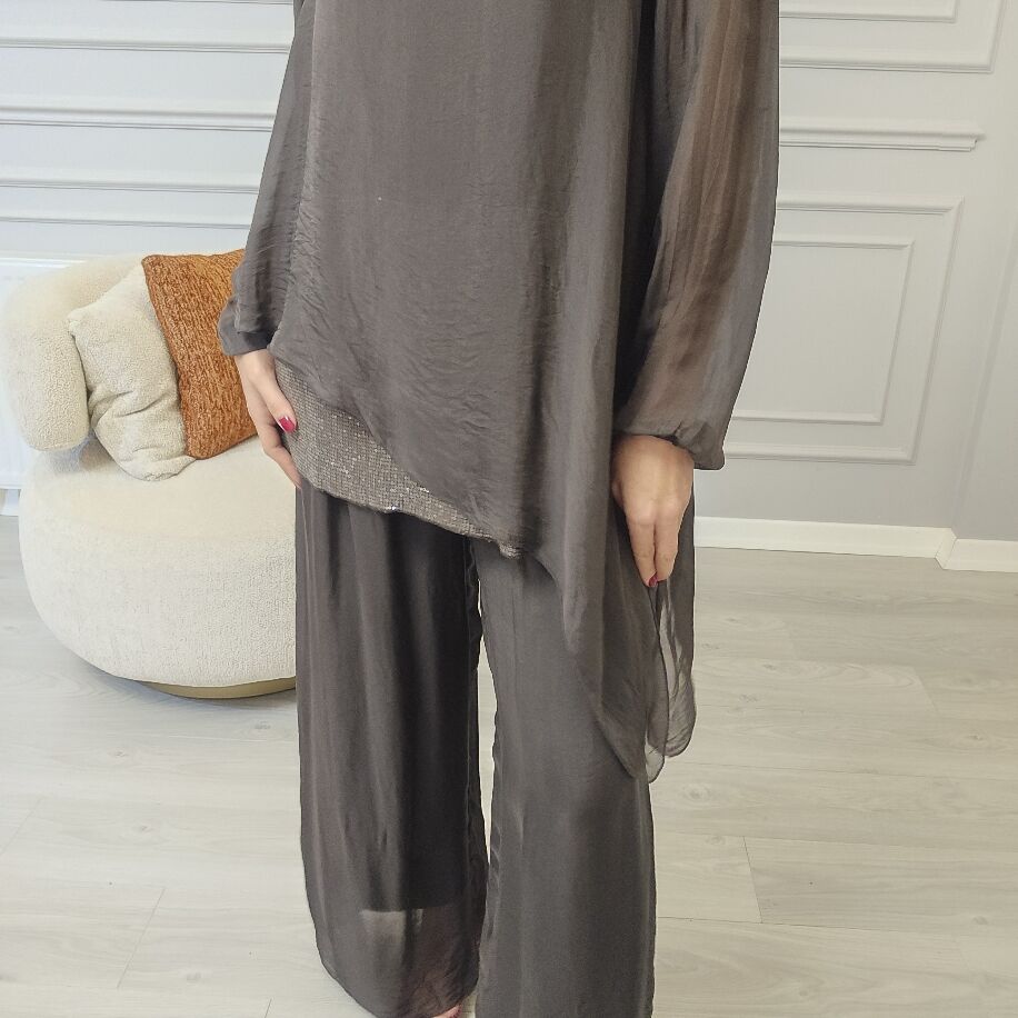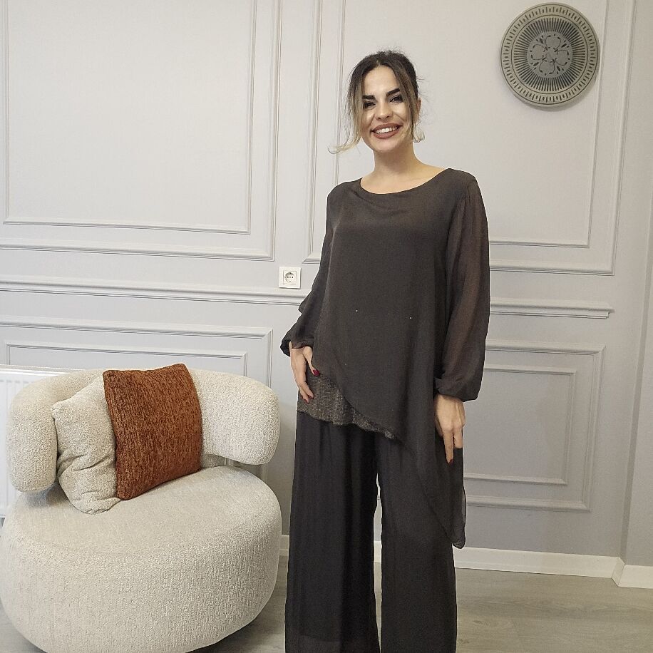 İthal İtalyan İpeği ile Zarafet ve Şıklık! Bu özel iki parçalı takım, uzun kollu bluz ve şık pantolondan oluşuyor. 36-46 beden aralığına mükemmel uyum sağlayan bu takım, iç astarı ve bilekteki lastikli detaylarıyla rahatlığı ön planda tutuyor. Bluzun çapraz inen kesimi ve kalça altına kadar uzanan payet detayı, her kombine zarafet katıyor. Bu eşsiz parça, özel davetlerden günlük şıklığa kadar her anınıza eşlik edecek.