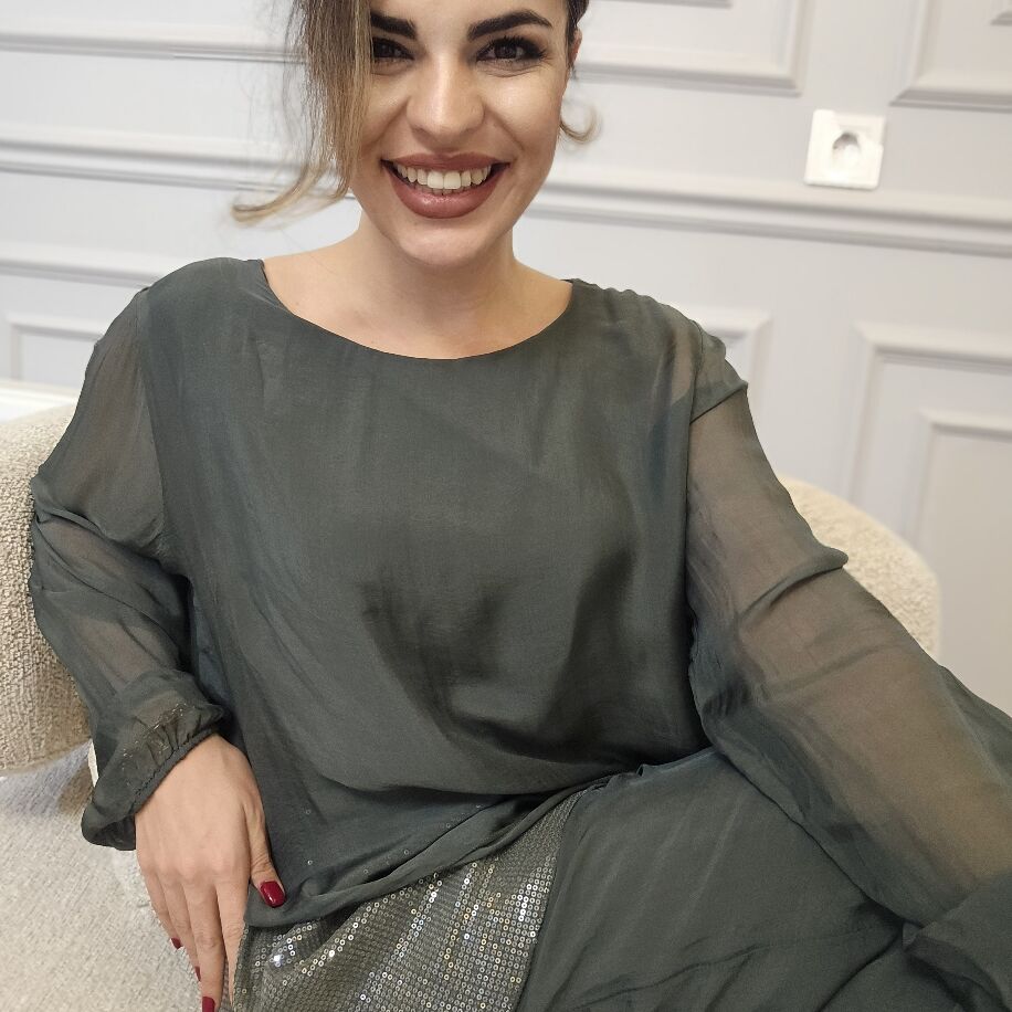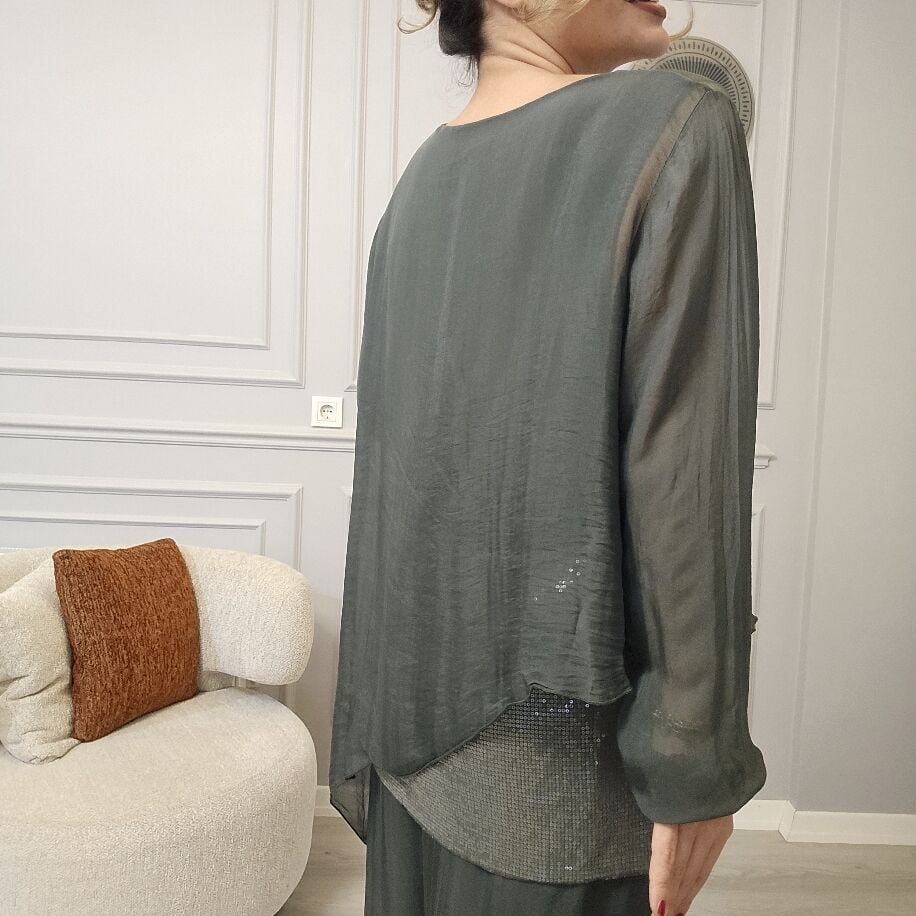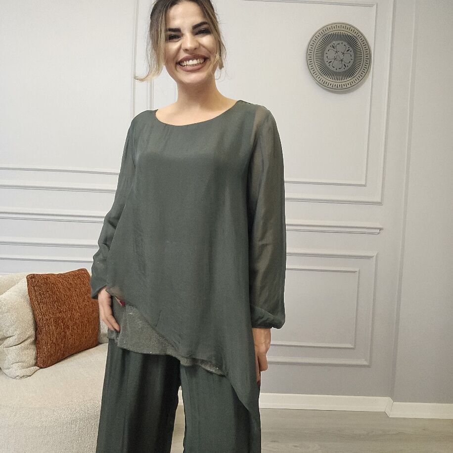 İthal İtalyan İpeği ile Zarafet ve Şıklık! Bu özel iki parçalı takım, uzun kollu bluz ve şık pantolondan oluşuyor. 36-46 beden aralığına mükemmel uyum sağlayan bu takım, iç astarı ve bilekteki lastikli detaylarıyla rahatlığı ön planda tutuyor. Bluzun çapraz inen kesimi ve kalça altına kadar uzanan payet detayı, her kombine zarafet katıyor. Bu eşsiz parça, özel davetlerden günlük şıklığa kadar her anınıza eşlik edecek.