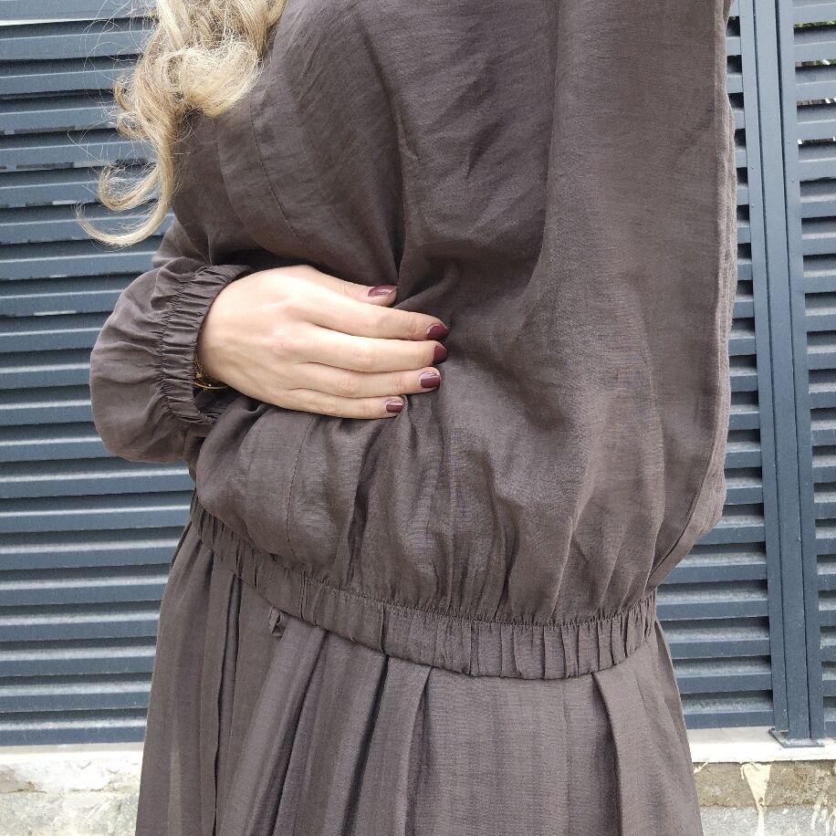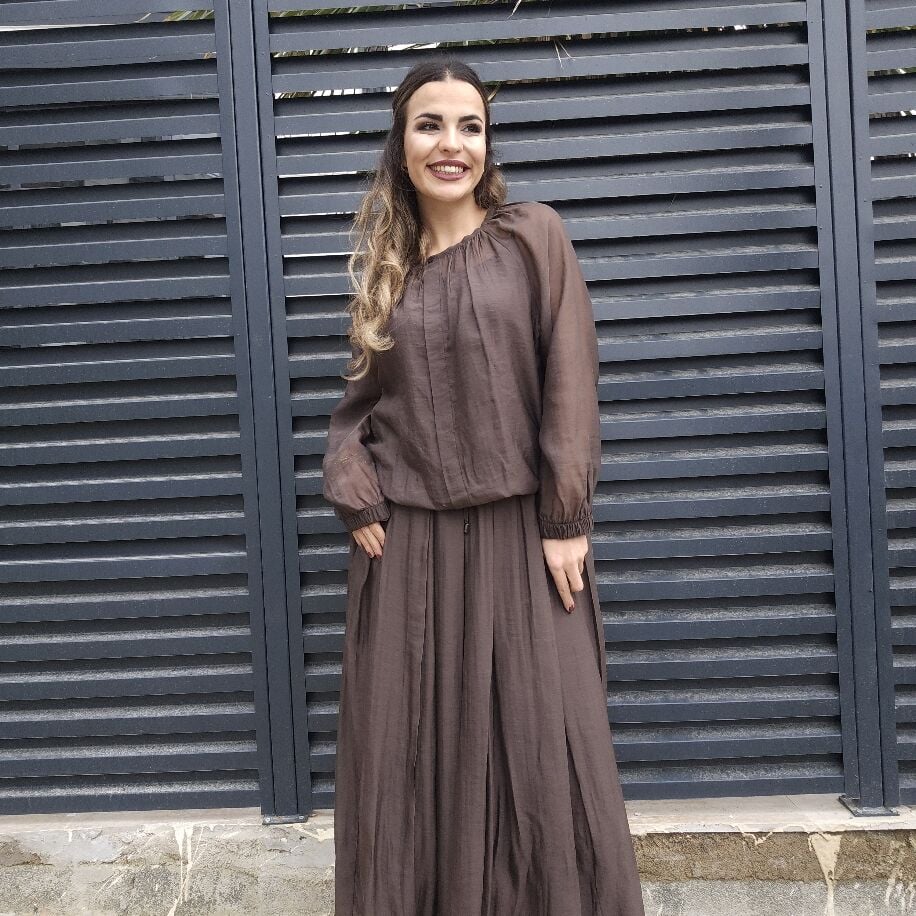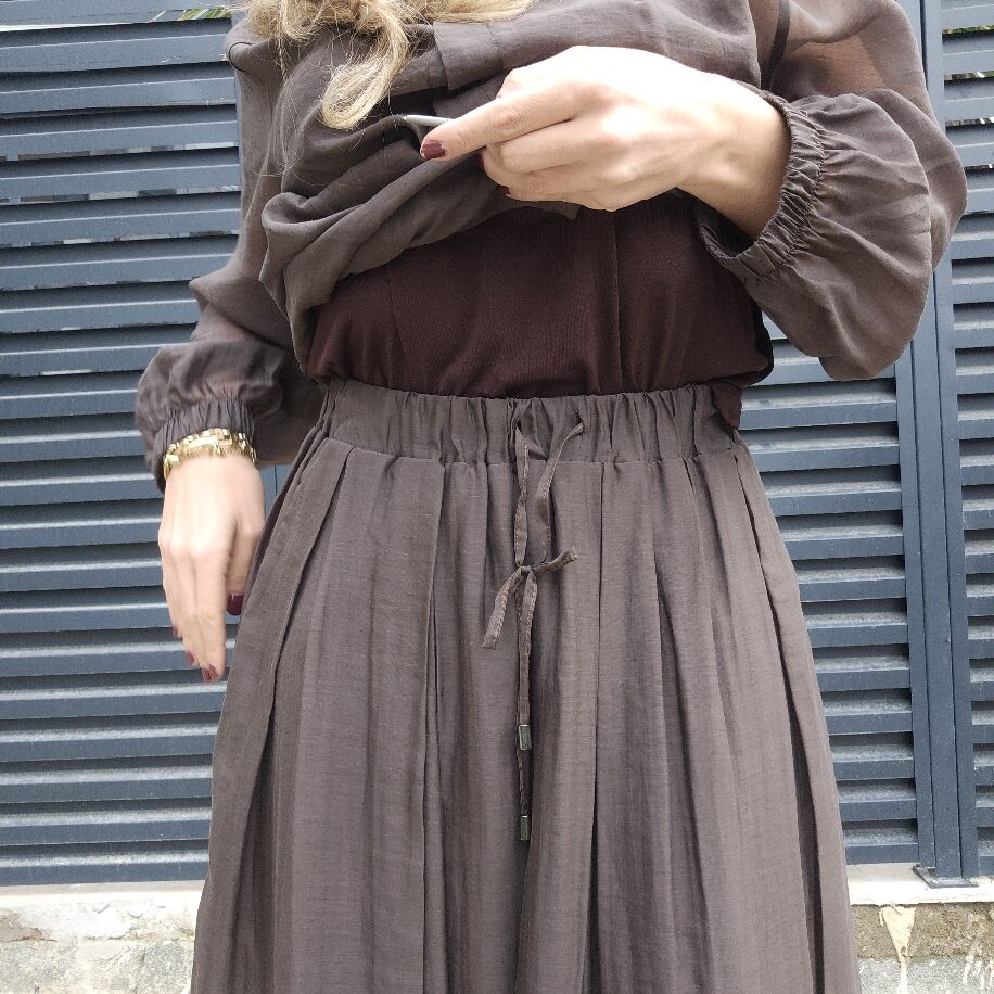 İtalyan Zarafetiyle Işıldayın! İtalyan tasarımının zarafetini yansıtan bu iki parçalı takım ile şıklığınızı bir adım öne taşıyın. Bisiklet yakalı gömlek; önden düğmeleri, belde ayarlanabilen bağcığıve bilek kısmındaki zarif lastik detaylarıyla hem rahat hem de sofistike bir görünüm sunar. Pileli etek ise ipek saten kumaşının akışkanlığıyla, cep detayları ve ayak bileğine kadar zarif bir duruş sergiler ve belden bağcığıyla kusursuz uyum sağlar. Günlük kombinlerden özel davetlere kadar her anınıza eşlik edecek bu özel takım gardırobunuzun yıldızı olacak!