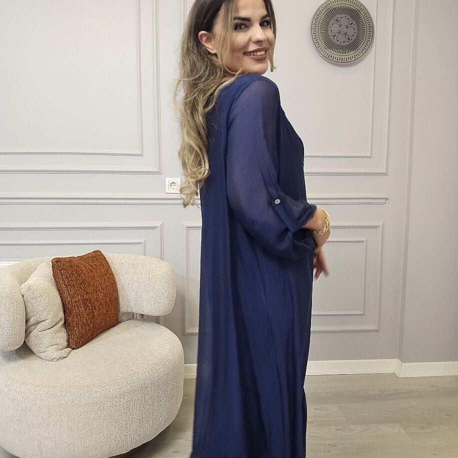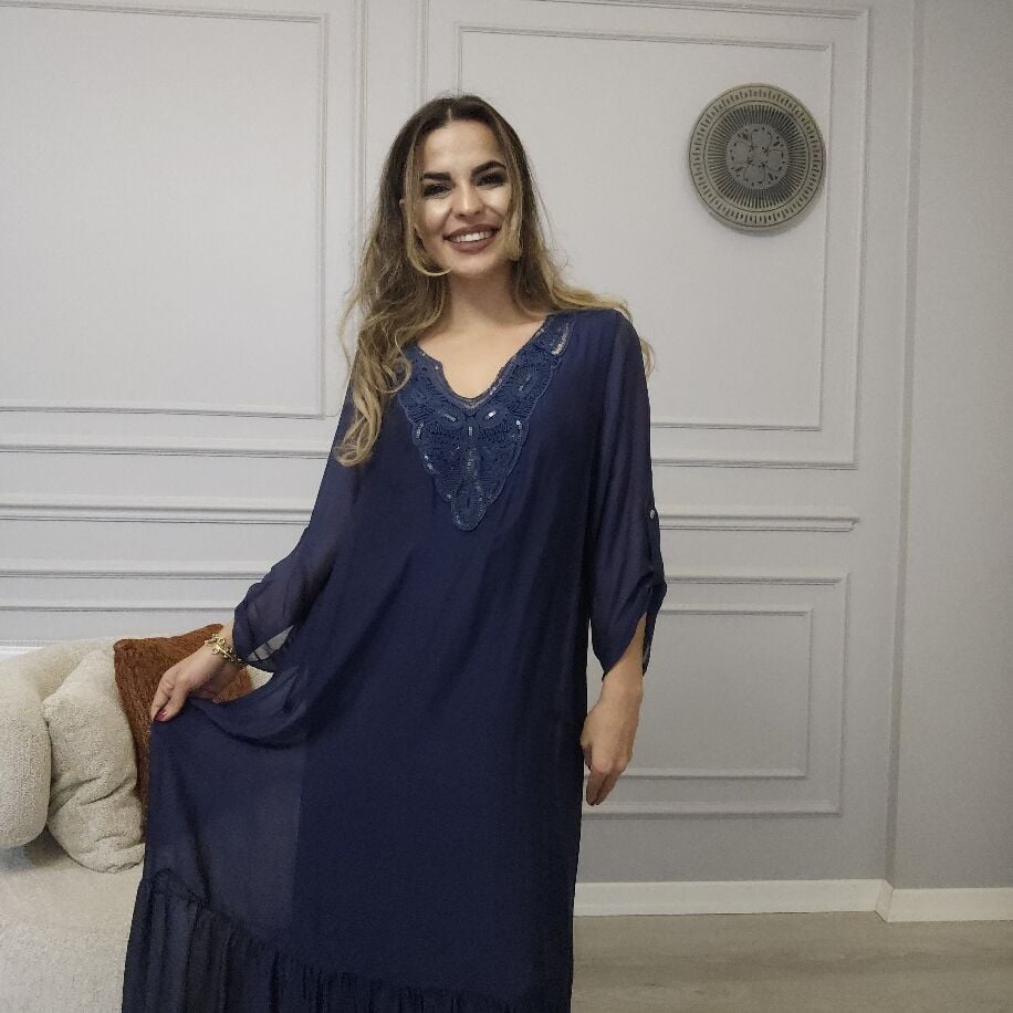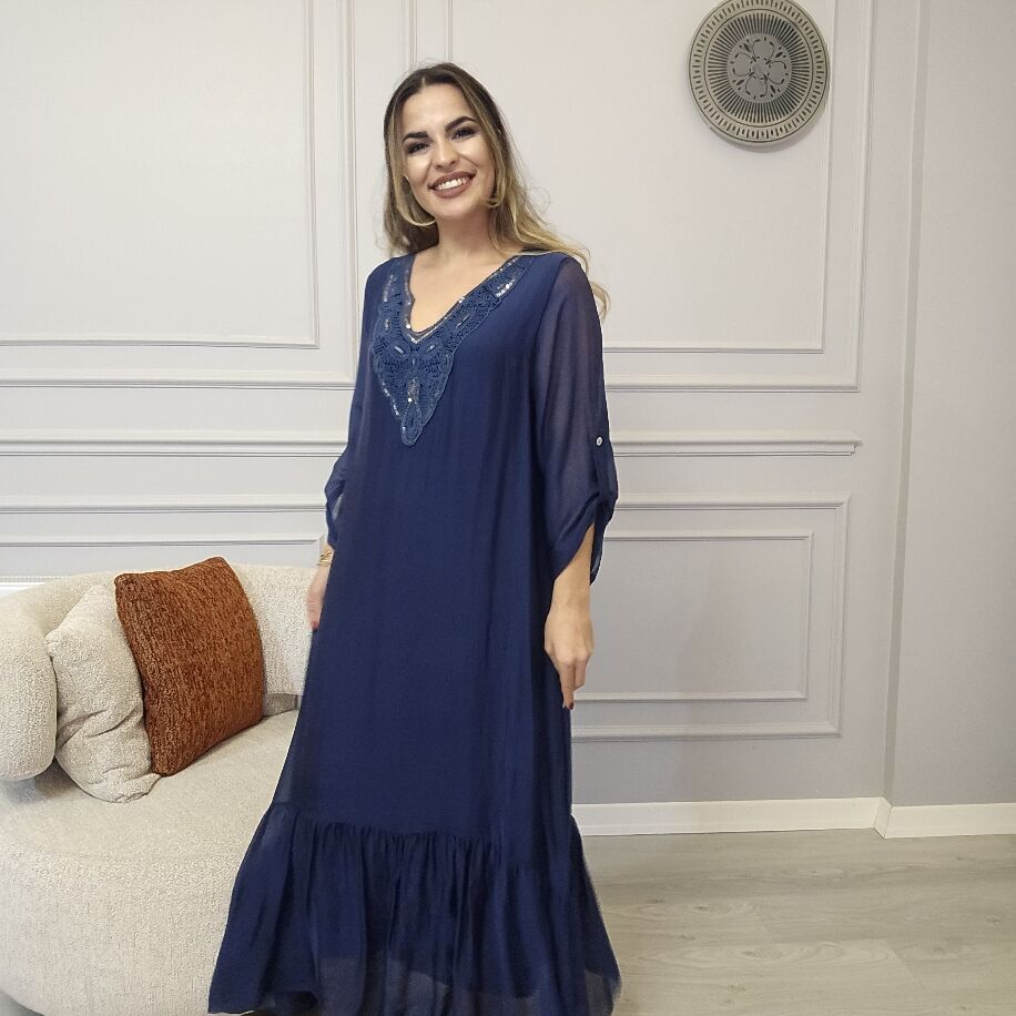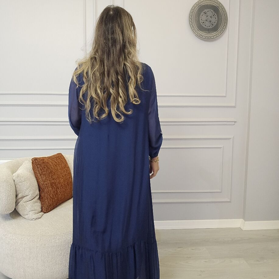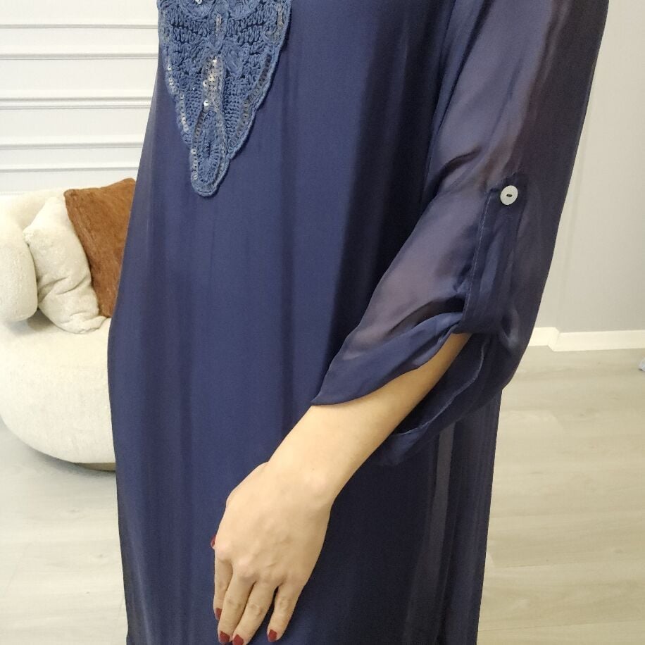 İtalyan V İpek Elbise Lacivert