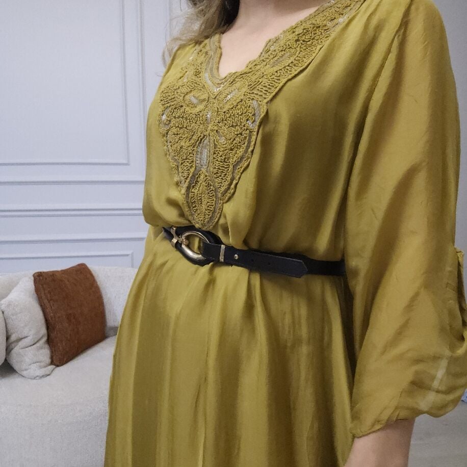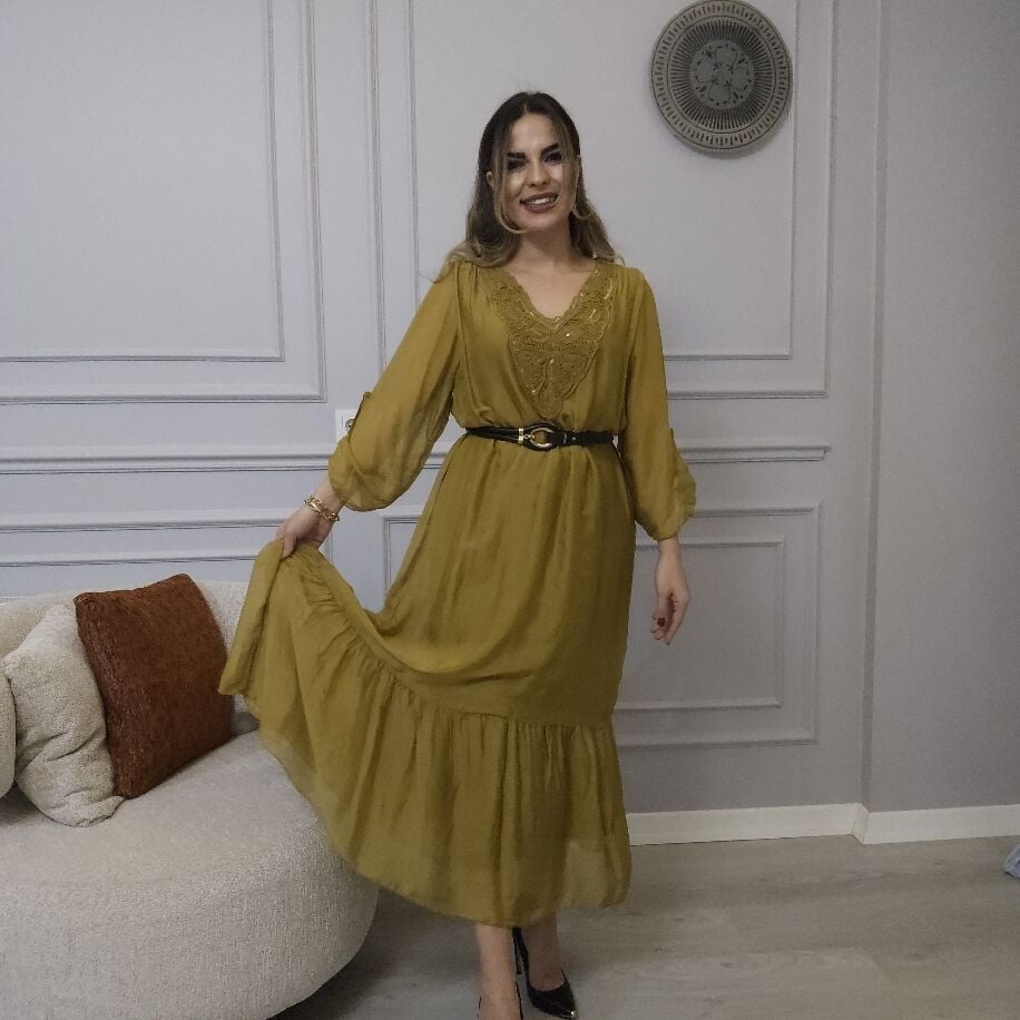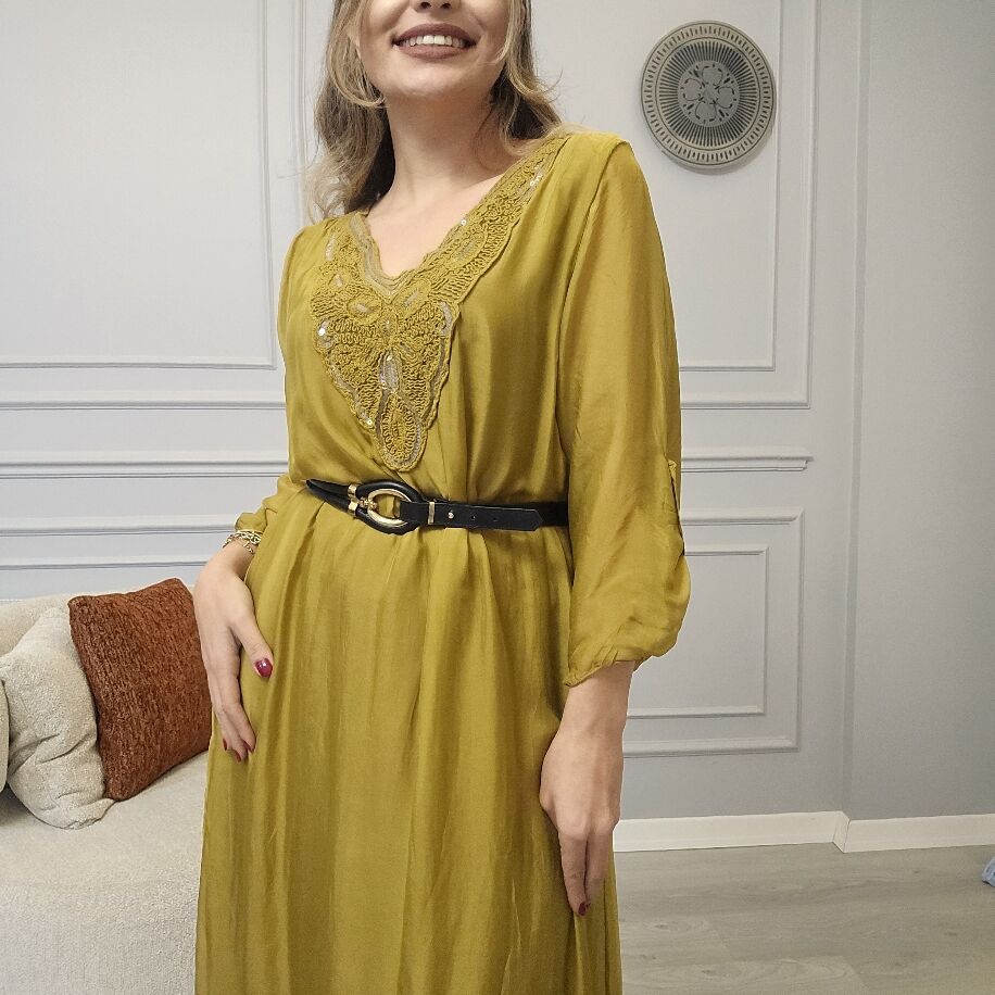 İtalyan V İpek Elbise Sarı