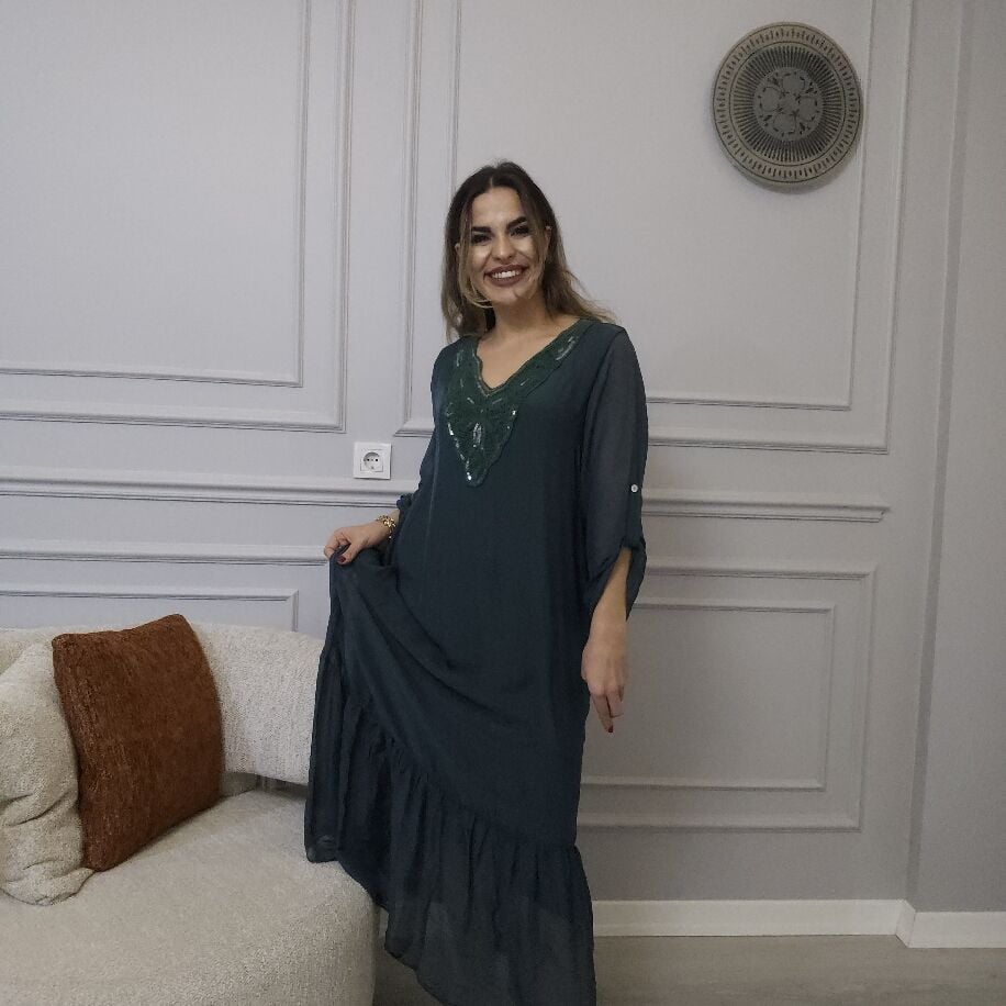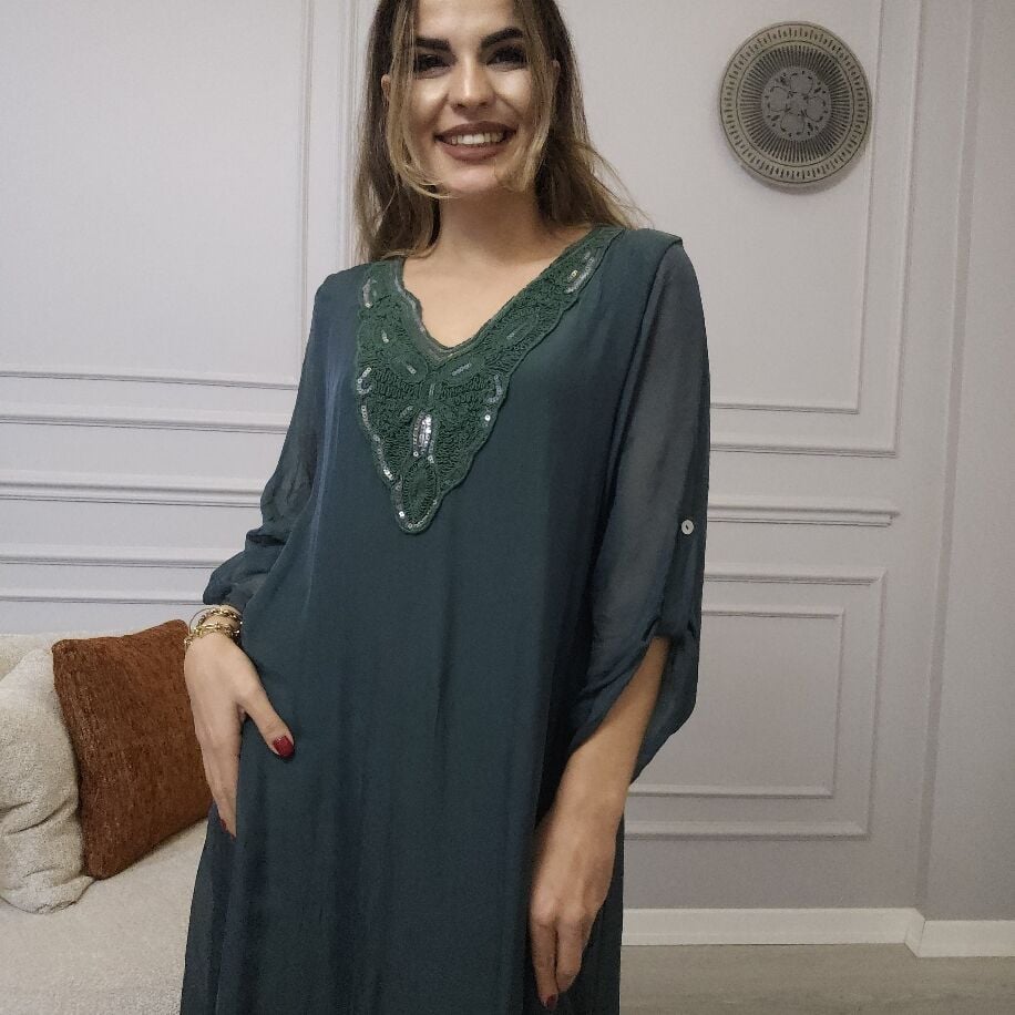 Zamansız şıklığın temsilcisi! İtalyan ipeğinden üretilmiş bu parça, tuvarkal kol detayı ve salaş modeliyle göz alıyor. V yakasında zarif dokuma ve payet detayları, her kombinde farklı bir şıklık sunar. Kemerle ya da farklı aksesuarlarla kolayca kombinlenebilir. 36'dan 44 bedene kadar uyum sağlar ve her ortamda şıklığınızı tamamlar.
