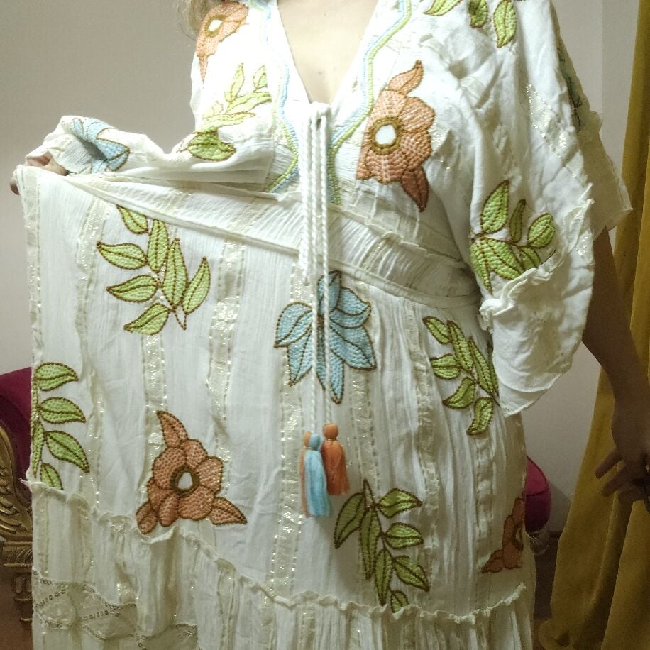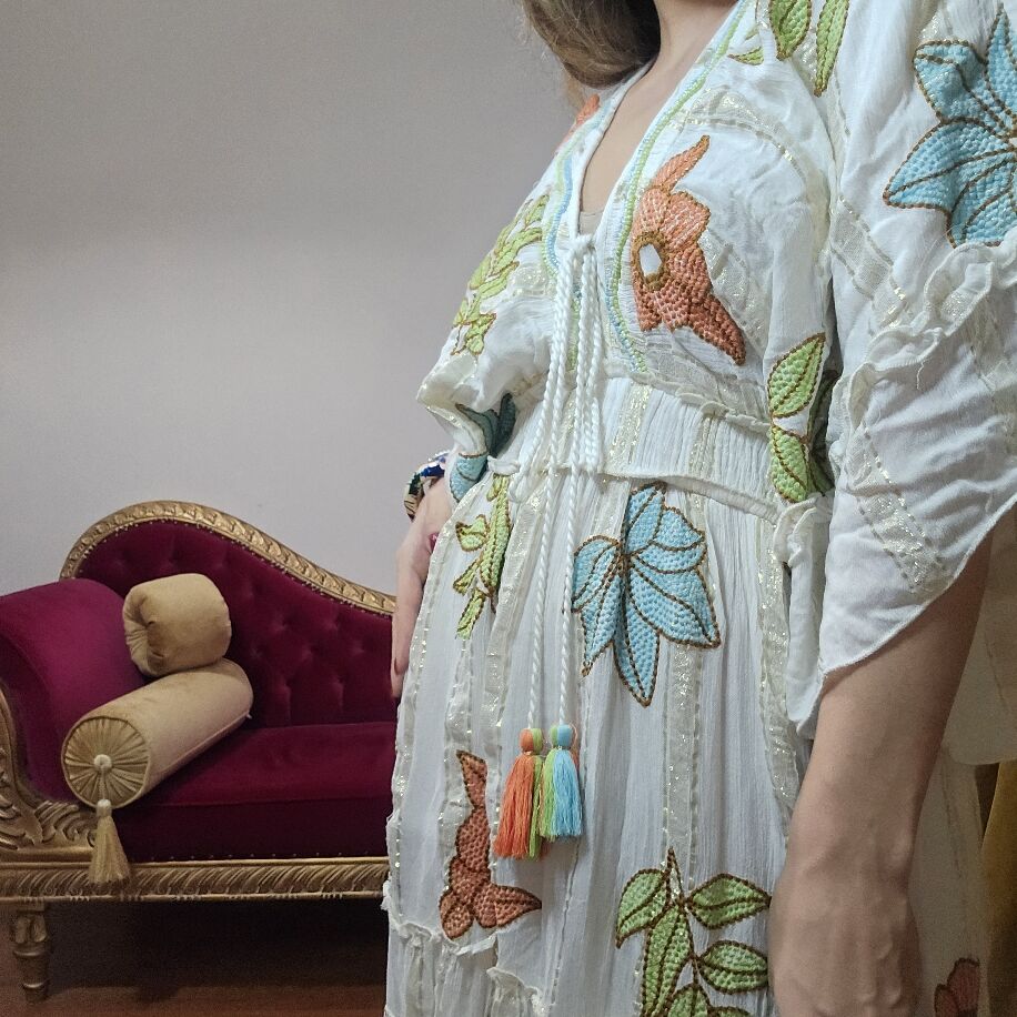 Üzerinizde Bir Sanat Eseri Taşıyın: El İşlemesi Bohem Zarafet! Modanın en doğal ve en şık haliyle tanışmaya hazır mısınız? Tamamı ithal ve üzerindeki her bir motifi tek tek el işçiliği ile işlenmiş bu özel tasarım, gardırobunuzun en nadide parçası olacak. Neden Bu Elbise? Kusursuz El İşçiliği: Makine nakışı değil, her detayı sabırla ve sevgiyle işlenmiş gerçek el emeği. Işıltılı Dokunuşlar: Kumaşın arasına gizlenmiş dore (altın) detaylar, güneş ışığında size eşsiz bir parıltı katar. Bohem Ruh: Püsküllü bel detayı ve volanlı eteğiyle özgür ve şık bir duruş sergiler. Beden Aralığı: 36 - 44 beden arasına uyumludur (Esnek ve dökümlü yapısıyla mükemmel uyum sağlar). Kalite: Özel ithal kumaş, nefes alan doku. İster şık bir akşam yemeğinde, ister sahil kenarında... Bu elbise ile tüm bakışların üzerinizde olmasına hazır olun!