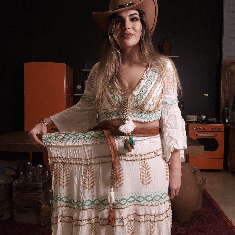 Sanatı ve şıklığı üzerinizde taşımaya ne dersiniz? Beyazın saf dokusunu, usta ellerden çıkan el boyaması ve el işçiliğiyle buluşturduk. Bu özel ithal takım, gardırobunuzun en özgün ve joker parçası olmaya aday! Tuvalden Üzerinize: El Boyaması El İşçiliği İthal Takım Sıradan kıyafetlerin ötesinde, her bir detayı titizlikle işlenmiş bir sanat eseriyle tanışın. Beyaz üzerine kurgulanan iki farklı renk tonlamasıyla sunulan bu crop-etek takımı, her tarza ve her mekana uyum sağlayan eşsiz bir enerjiye sahip. Bu Takımı Neden Çok Seveceksiniz? Zanaatkar Dokunuşlar: Üzerindeki desenlerin tamamı el boyaması olup, detaylardaki parıltılar ve süslemeler tamamen el işçiliğidir. Her parça size özel! İkonik Crop Etek Uyumu: * Üst: Göğüs kısmındaki bağlama detayları ve geniş İspanyol kollar ile bohem bir şıklık sunar. Etek: Kat kat inen, dökümlü ve uçuş uçuş maxi boy etek ile hareketlerinize zarafet katar. İki Renk Seçeneği: İster toprak tonlarının sıcaklığını, ister mavi ve mavinin huzur veren tonlarını seçin. Her iki kombinasyon da beyaz üzerinde bir güneş gibi parlıyor. Kusursuz Kalıp: Akıllı tasarımı sayesinde 36 bedenden 44 bedene kadar her vücut tipine mükemmel uyum sağlar. Çok Yönlü Kullanım: İster takımı bir bütün olarak giyip bir davete katılın, ister parçaları ayrı ayrı kombinleyerek günlük stilinize dahil edin. Her koşulda göz kamaştıracaksınız! Stil Notu: Bu takımı hasır sandaletler ve bir kovboy şapkasıyla festival moduna taşıyabilir veya topuklu ayakkabılarla şık bir akşam yemeğinin yıldızı olabilirsiniz