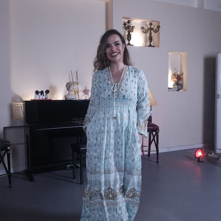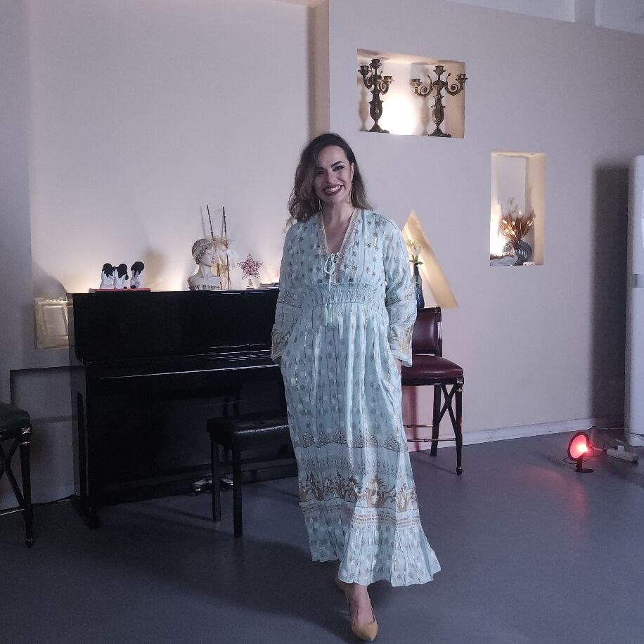Işıltınızı Sanatla Birleştirin: El Boyaması Metalik Detaylı İthal Elbise Sıradan elbiseleri unutun! Hem modern hem de mistik bir hava sunan bu ithal model, üzerindeki el boyaması metalik baskıları ve titiz el işçiliğiyle fark yaratmak isteyen kadınlar için tasarlandı. Öne Çıkan Ayrıcalıklar: Zanaatkar Dokunuşu: Elbisenin üzerindeki tüm metalik desenler el boyamasıdır ve her bir işleme el işçiliği ile detaylandırılmıştır. Kusursuz Kesim: Hem ön hem de arka kısmında derin V yaka inişiyle feminen bir duruş sergiler. İkonik Bağlama Detayı: Ön kısmındaki şık çapraz ip geçişleri, ucunda zarif bir sarkı (püskül) ile tamamlanarak elbiseye hareket katar. Konfor ve Fonksiyonellik: Şıklığınızdan ödün vermeden günlük rahatlık sunan cep detayları mevcuttur. Geniş Beden Aralığı: Esnek yapısı ve akıllı kesimi sayesinde 36 bedenden 44 bedene kadar her vücut tipine mükemmel uyum sağlar. Zarif Kollar: Uzun kol tasarımı, elbisenin asaletini tamamlayarak her mevsim kullanım imkanı sunar. Stil Önerisi: İster şık bir topukluyla davetlerin yıldızı olun, ister günlük hayatta sandaletlerle o meşhur "uçuş uçuş" bohem havayı yakalayın. Bu model, her tarza ve her mekana uyum sağlayacak kadar çok yönlüdür.