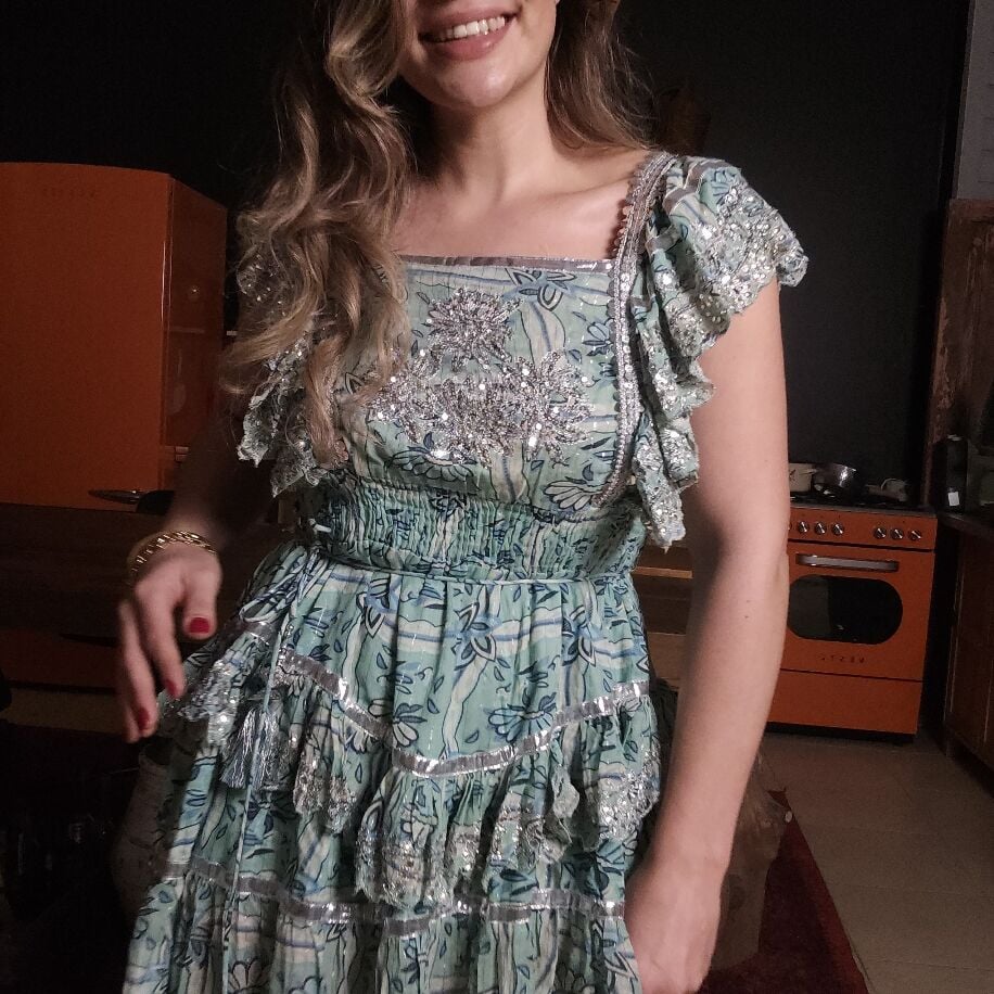 Gold Serisi'nin Mini Enerjisini Keşfedin! Çok sevilen serimizin bu kez mini ve dinamik versiyonuyla tüm bakışları üzerinize çekmeye hazır mısınız? İthal kalitesiyle sunulan bu özel parça, akıllı kesimi sayesinde 36 bedenden 42 bedene kadar her vücut tipine kusursuz bir uyum sağlıyor. Neden Bu Mini Tasarımı Seçmelisiniz? Zanaatkar Dokunuşu: Göğüs kısmındaki göz alıcı el işçiliği detayları ve parıltılı işlemelerle her ortamda ışıldayın. Hareketli Detaylar: Omuzlardaki fırfır detayları ve kat kat inen "uçuş uçuş" etek yapısıyla stilinize feminen bir hava katın. Kombin Özgürlüğü: İster kovboy botları ve şapkanızla festival ruhunu yakalayın, ister şık bir sandaletle akşam şıklığına geçiş yapın. İkonik Gold Serisi: Farklı renk seçenekleri ve zarif el boyaması detaylarıyla bu mini parça, gardırobunuzun en joker yatırımı olacak. Gold Serisi'nin bu ikonik mini parçasıyla şıklığı, zarafeti ve konforu aynı anda yaşayın!