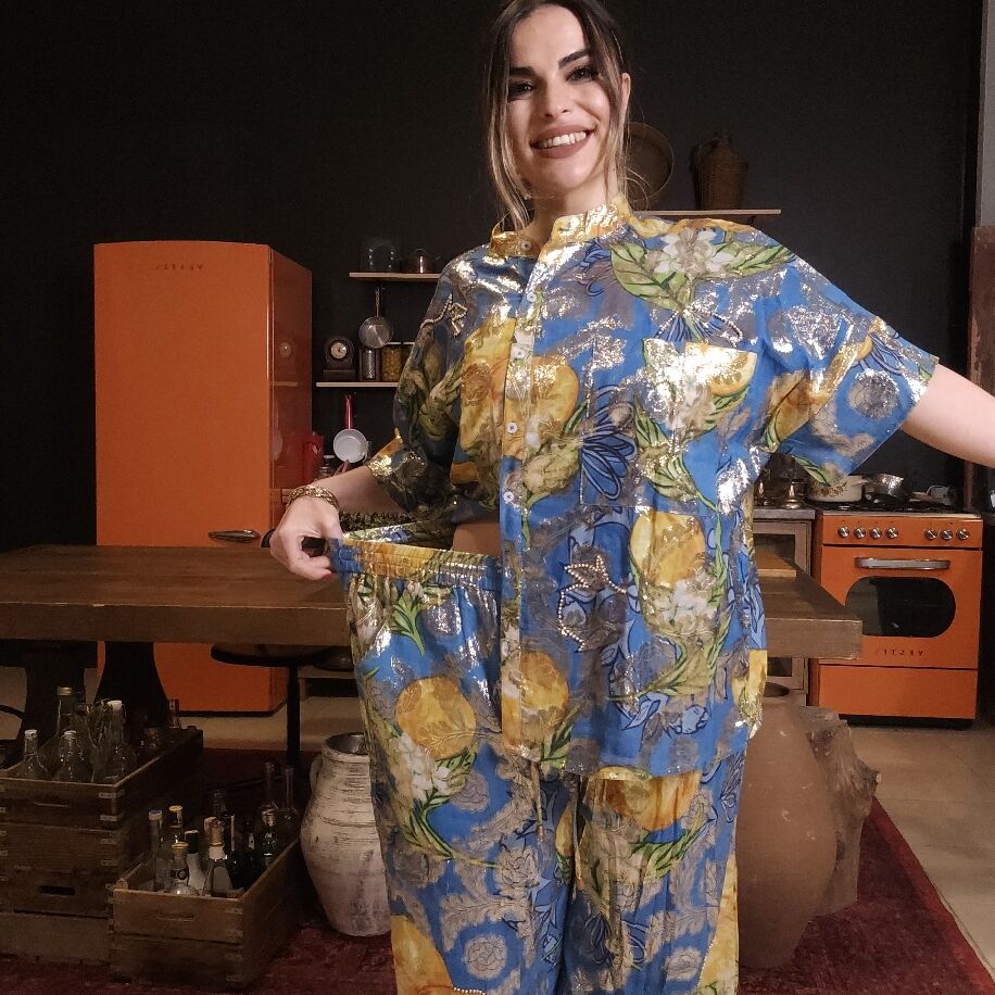 Limon Enerjisi ve Pantolon Konforu: İthal İki Parçalı Tasarım Takım Akdeniz rüzgarlarını stilinize taşımaya hazır mısınız? Özel tasarım limon desenleri ve koton-akrilik kumaşın eşsiz uyumuyla bu takım, gardırobunuzun en ferah ve iddialı parçası olacak. Neden Bu Pantolonlu Takımı Seçmelisiniz? Sanat Eseri Desenler: Canlı limon motifleri ve kumaşın üzerindeki metalik ışıltılar, her adımda parlamanızı sağlar. Mükemmel Kalıp: 36 bedenden 44 bedene kadar uyumlu yapısı ve dökümlü kesimiyle her vücut tipine konforlu bir şıklık sunar. Fonksiyonel Tasarım: Üst parçanın düğmeli gömlek formu ve pantolonun geniş paçalı, "uçuş uçuş" yapısı hem günlük hayatta hem de özel davetlerde size eşlik eder. İki Renk Seçeneği: İster enerjik bir mavi, ister zarif bir ekru tabanlı desen; seçim sizin! Üstün Kumaş Kalitesi: İthal koton-akrilik karışımı kumaşıyla cildinize nefes aldırır ve lüks bir dokunuş hissettirir. Stil Notu: Bu takımı hasır sandaletlerle sahile, topuklu ayakkabı ve gold aksesuarlarla şık bir akşam yemeğine uyarlayabilirsiniz.