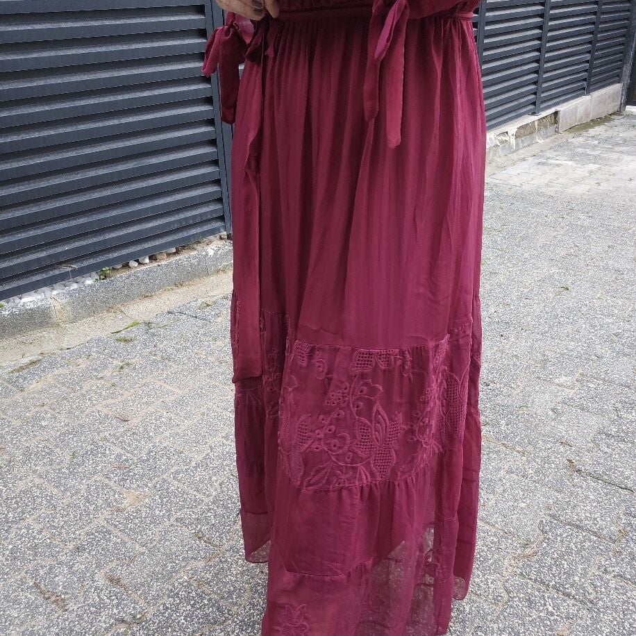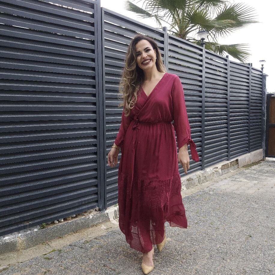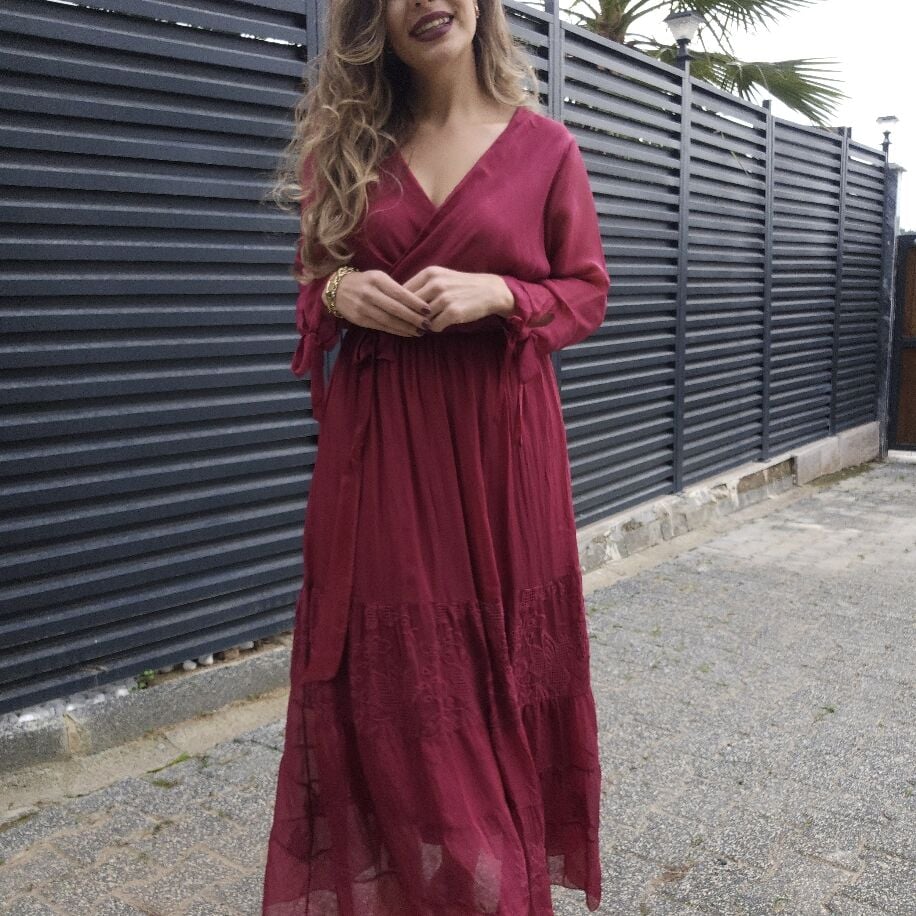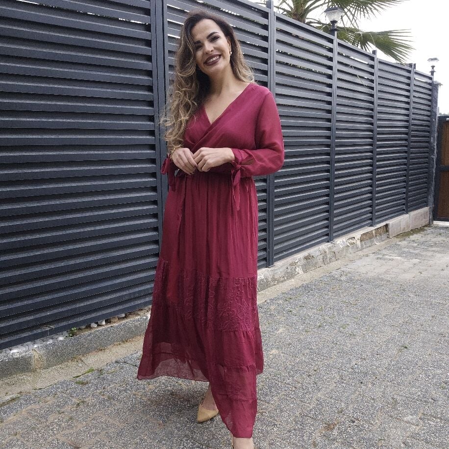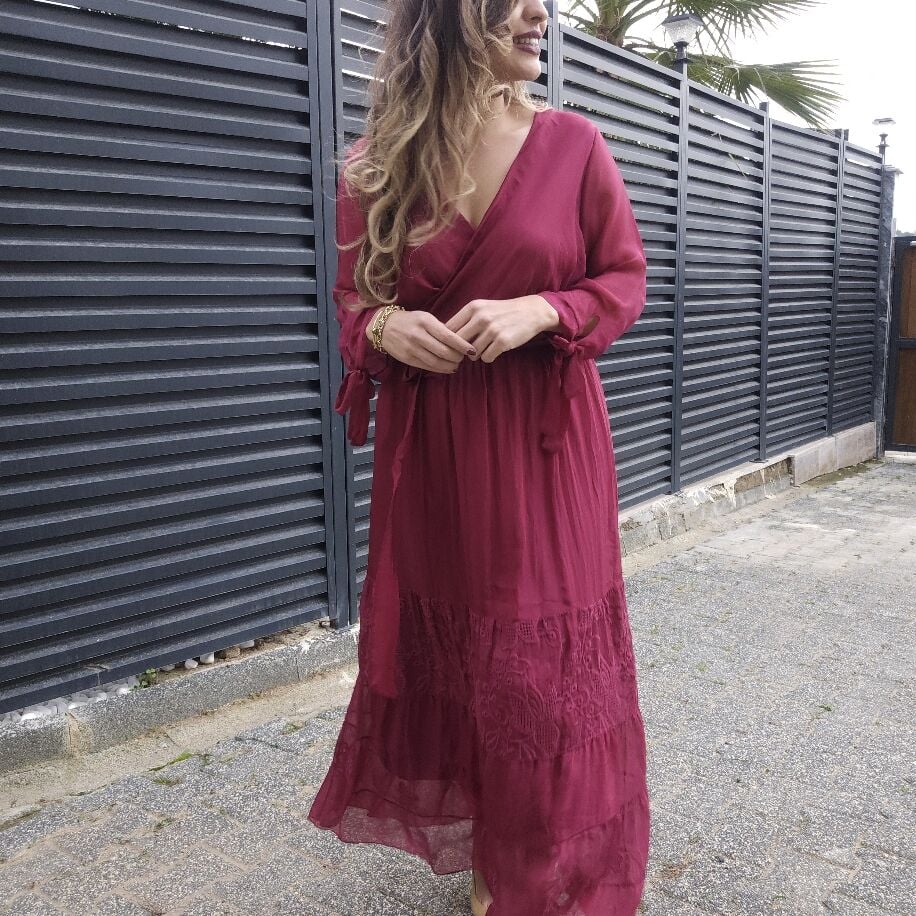 İtalyan ipeğinden üretilmiş bu şık elbise, kruvaze yakası ve göğüs altındaki lastikli bağlama detayıyla zarif bir duruş sunuyor. Kollarındaki bağlama detayları ve etek kısmına doğru çiçek dantelleriyle zarafeti tamamlıyor. Beş farklı renk seçeneğiyle ve 36 bedenden 42 bedene kadar uyum sağlayan bu özel parça, her tarza ve her an için ideal.