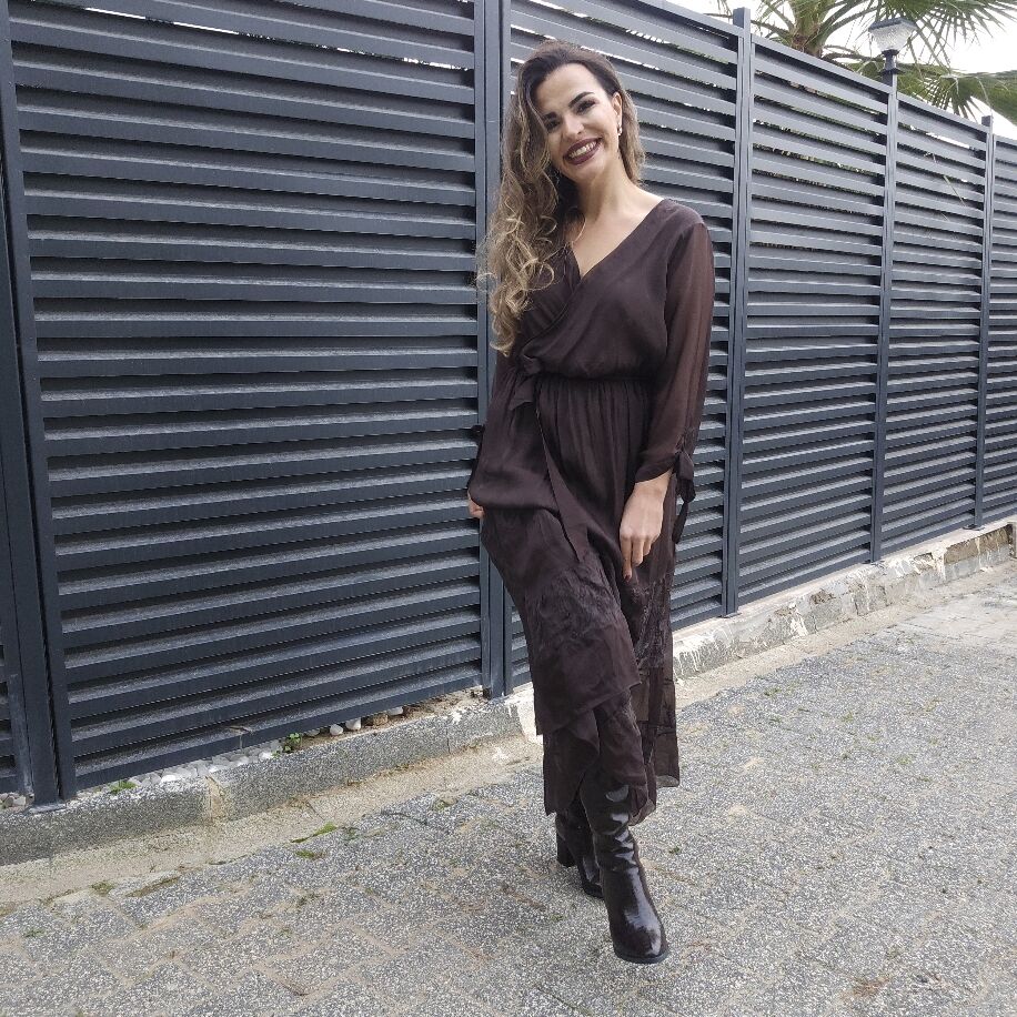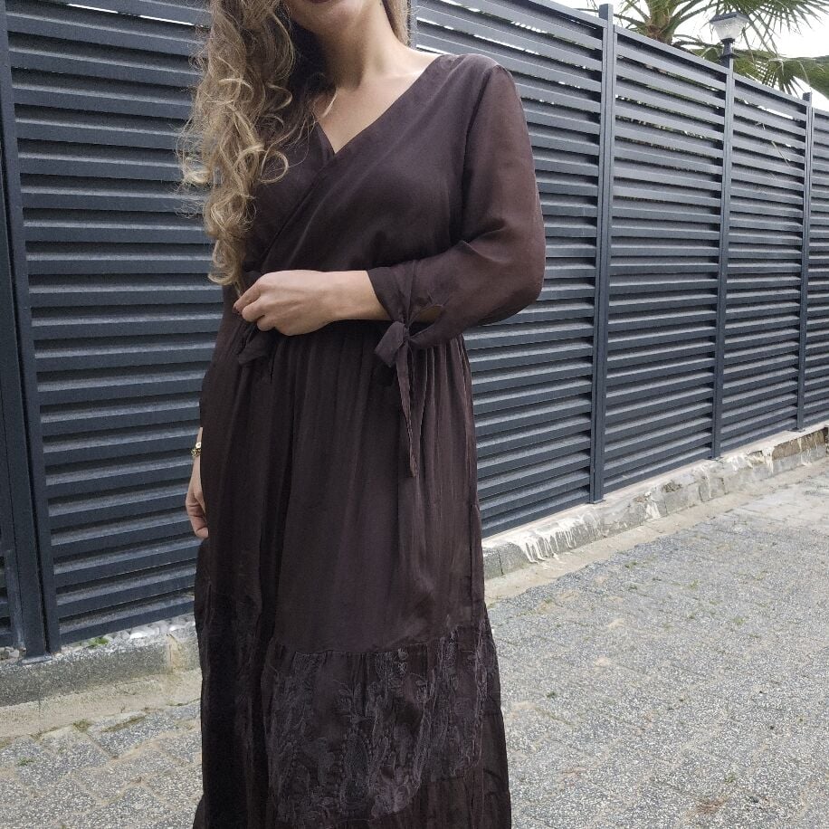 Kruvaze İpek Elbise Kahverengi