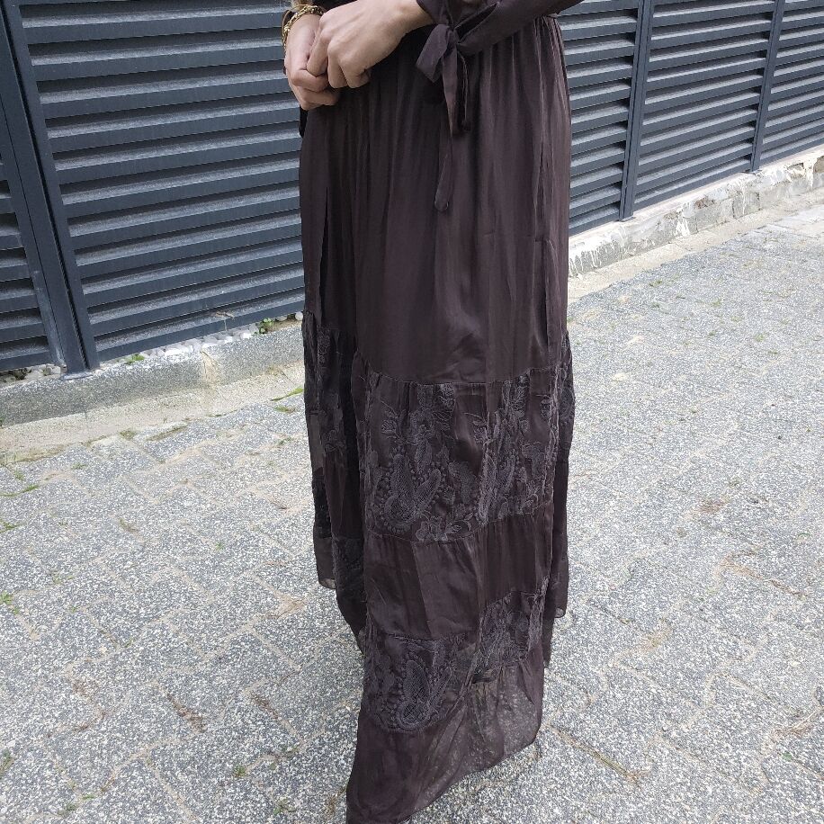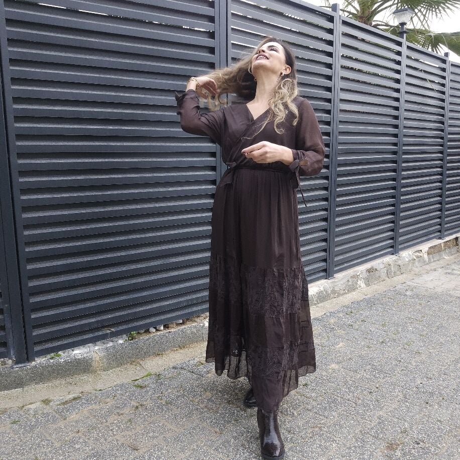 İtalyan ipeğinden üretilmiş bu şık elbise, kruvaze yakası ve göğüs altındaki lastikli bağlama detayıyla zarif bir duruş sunuyor. Kollarındaki bağlama detayları ve etek kısmına doğru çiçek dantelleriyle zarafeti tamamlıyor. Beş farklı renk seçeneğiyle ve 36 bedenden 42 bedene kadar uyum sağlayan bu özel parça, her tarza ve her an için ideal.