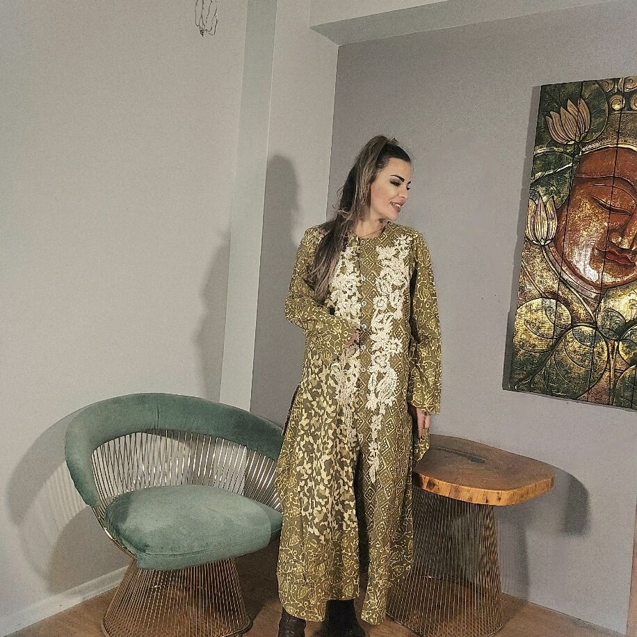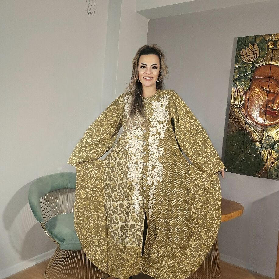 Üç farklı renkte sunulan bu ithal ürün, şık bir kap elbiseden oluşuyor. Tam boy kap elbise üzerindeki taş baskı motifleri, tamamen el işçiliğiyle işlenmiştir. Her tarza ve bedene uyum sağlayan bu özel parça, 36'dan 48 bedene kadar rahatlıkla uyum gösterir.