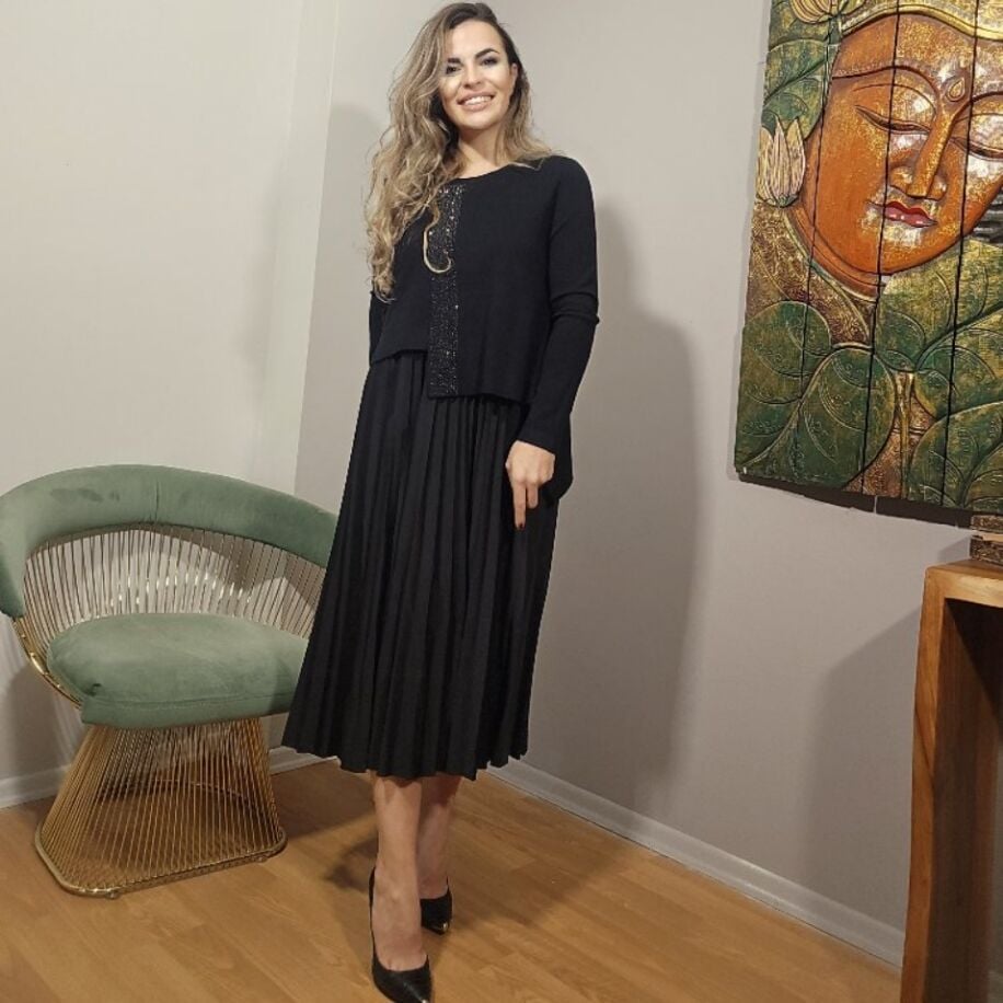 Zarafeti ve şıklığı bir arada sunan iki parçalı setimizle tanışın! İtalya menşeli Mercerize kumaştan üretilmiş kazak, minik taş detaylarıyla göz kamaştırıyor. Eteğimiz ise ipek ve saten karışımı, pileli tasarımıyla hem rahat hem de şık. Üç farklı renkte ve S-XL bedene kadar geniş bir uyum sunuyor.