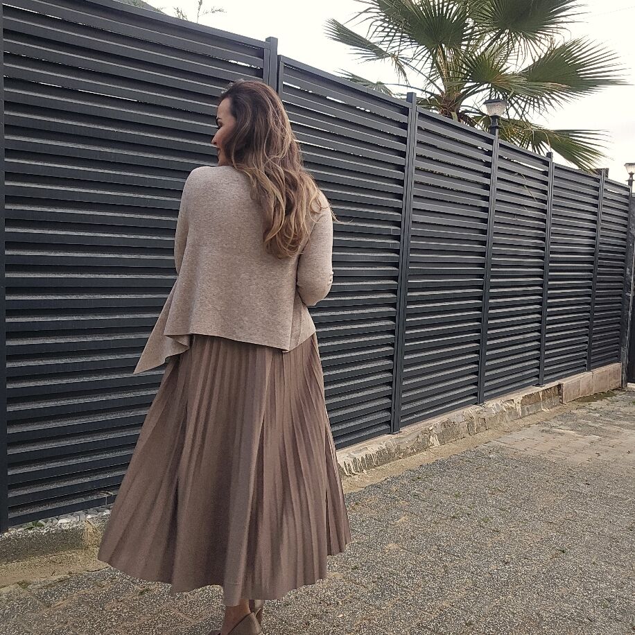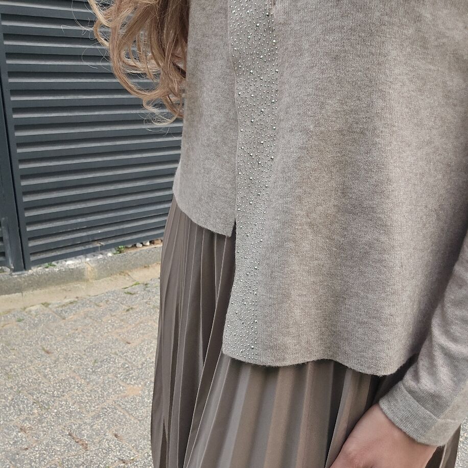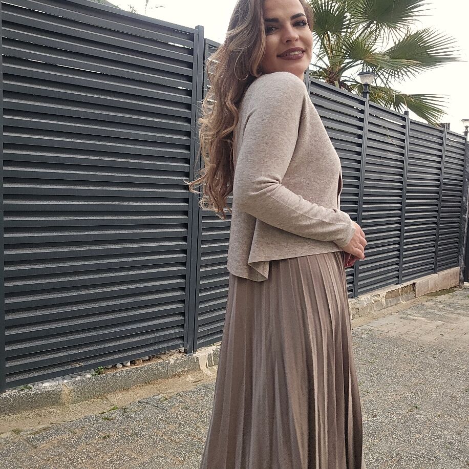 İtalya menşeli Mercerize kumaştan üretilmiş kazak, minik taş detaylarıyla göz kamaştırıyor. Eteğimiz ise ipek ve saten karışımı, pileli tasarımıyla hem rahat hem de şık. Üç farklı renkte ve S-XL bedene kadar geniş bir uyum sunuyor.