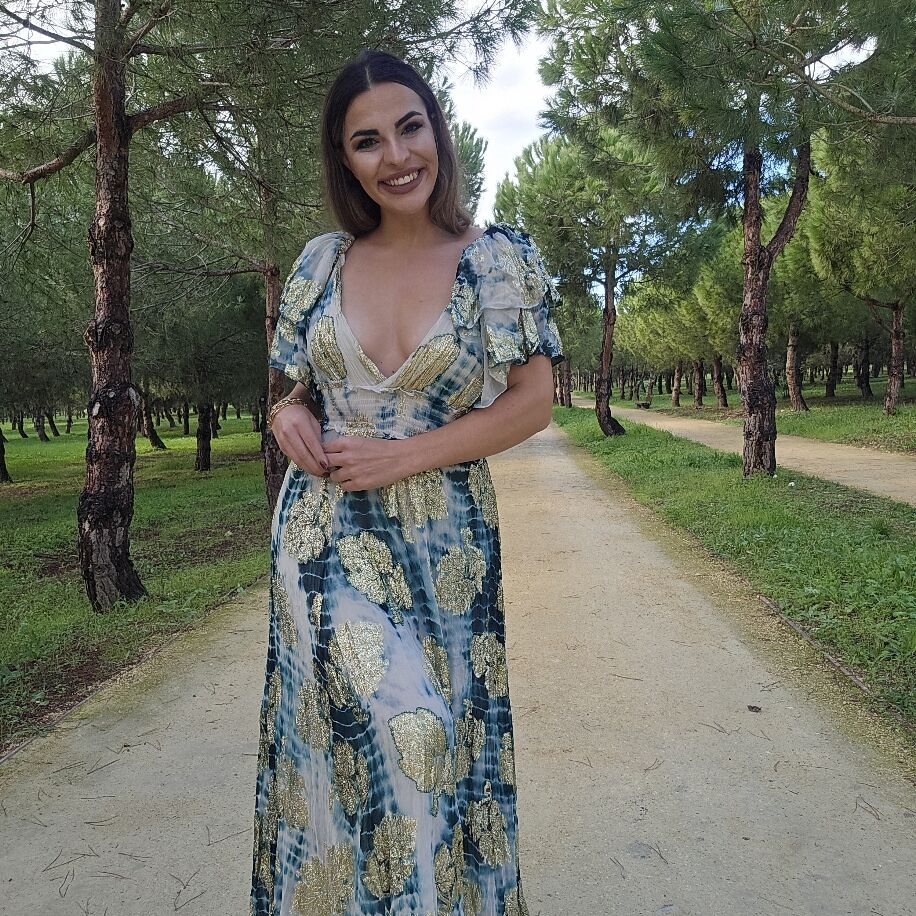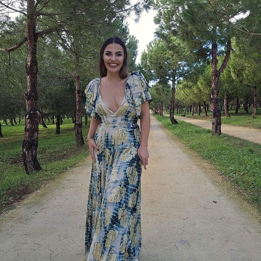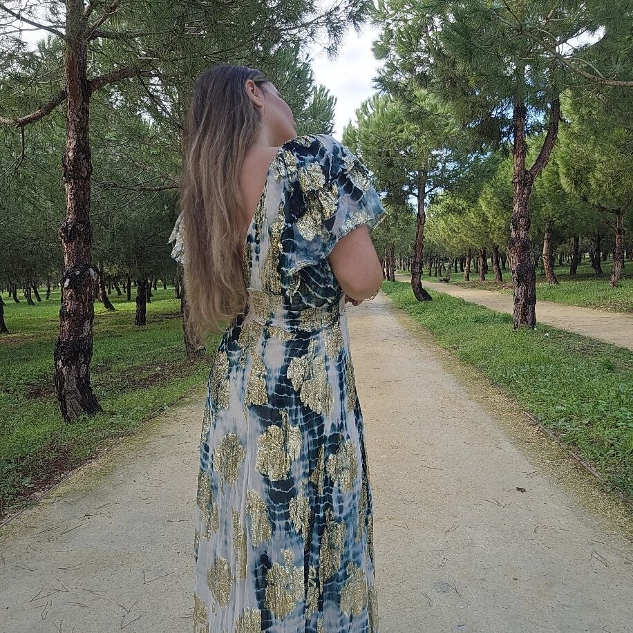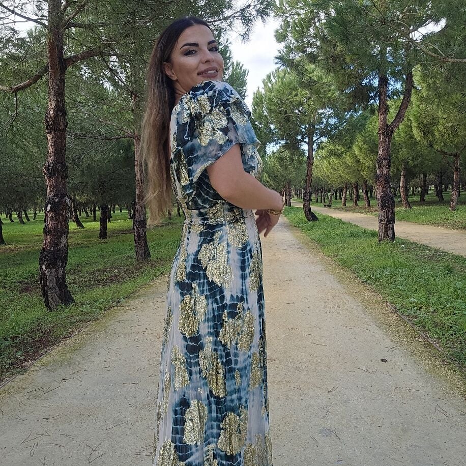 Siyah ve yeşil batik desenli, ithal şifon elbise. Metalik ip detayları ve minik boncuk işçiliğiyle zarafet katıyor. 36'dan 42 bedene kadar uyum sağlar.